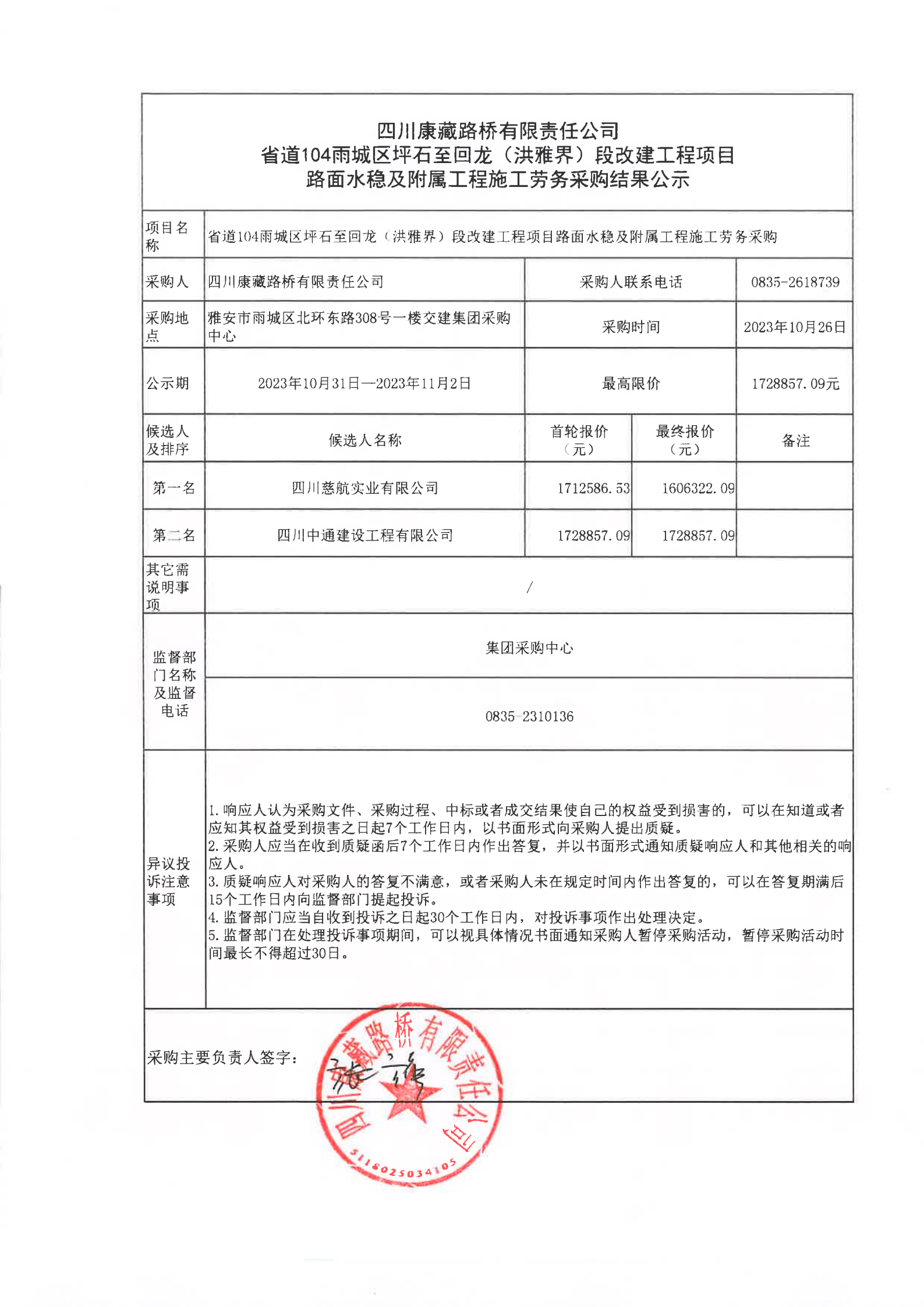四川康藏路橋有限責任公司省道104雨城區(qū)坪石至回龍(洪雅界)段改建工程項目路面水穩(wěn)及附屬工程施工勞務(wù)采購結(jié)果公示