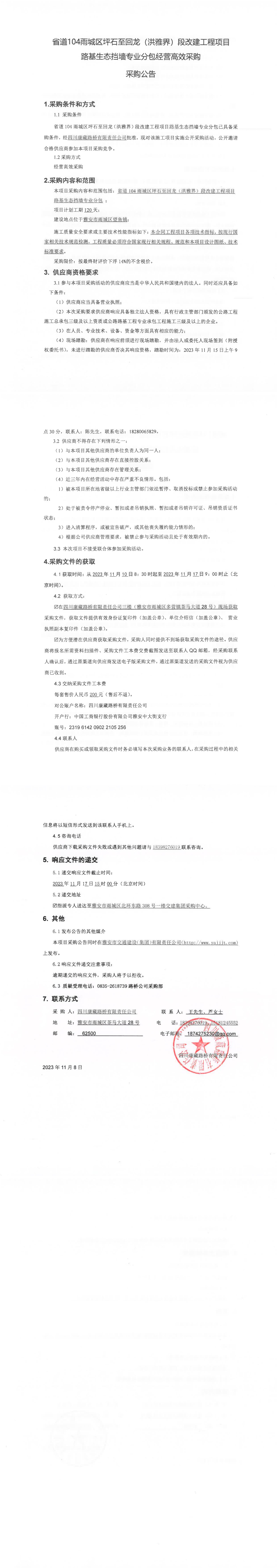 四川康藏路橋有限責(zé)任公司省道104雨城區(qū)坪石至回龍(洪雅界)段改建工程項(xiàng)目路基生態(tài)擋墻專業(yè)分包經(jīng)營(yíng)高效采購(gòu)公告