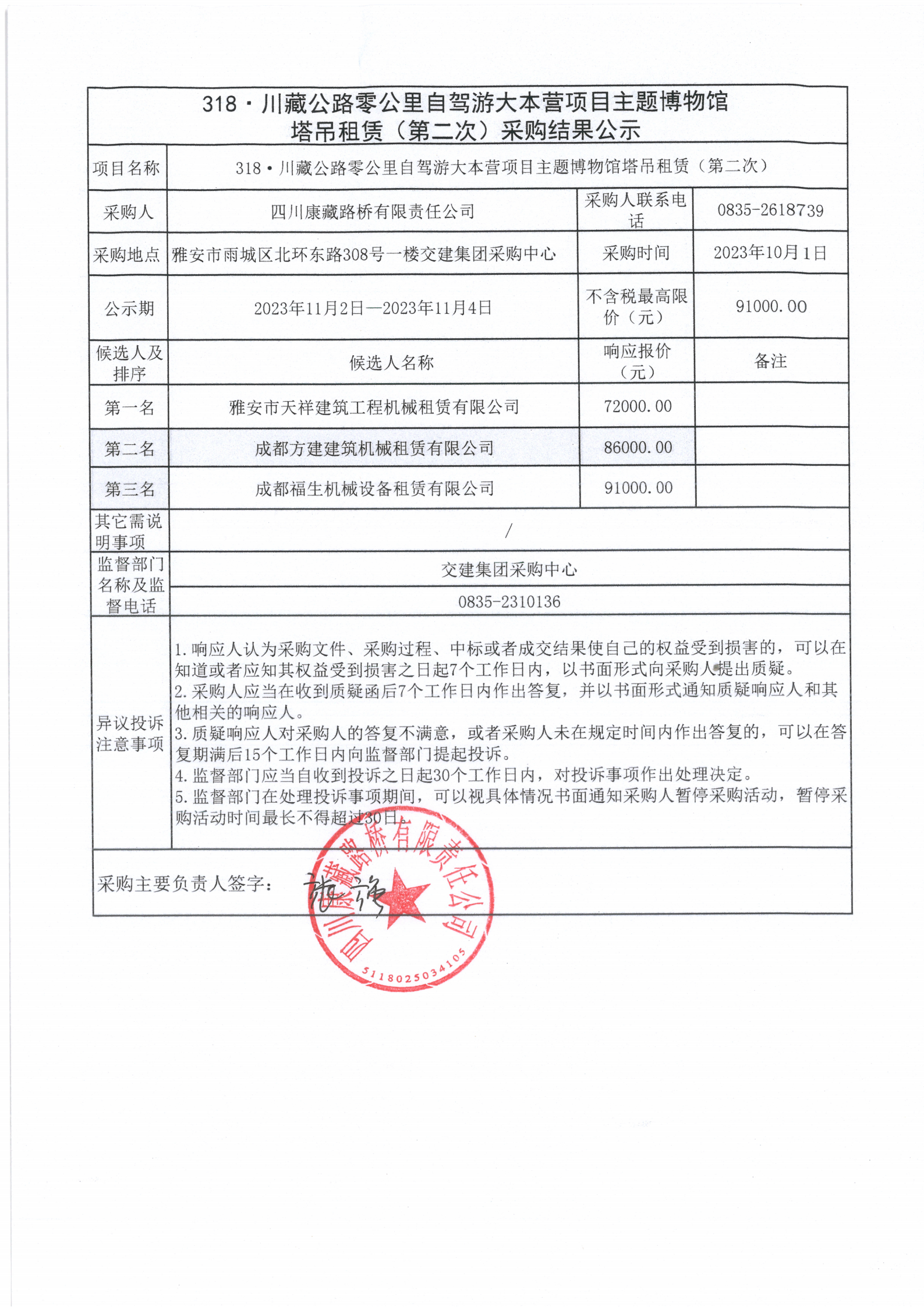 四川康藏路橋有限責(zé)任公司318·川藏公路零公里自駕游大本營(yíng)項(xiàng)目主題博物館塔吊租賃(第二次)采購結(jié)果公示