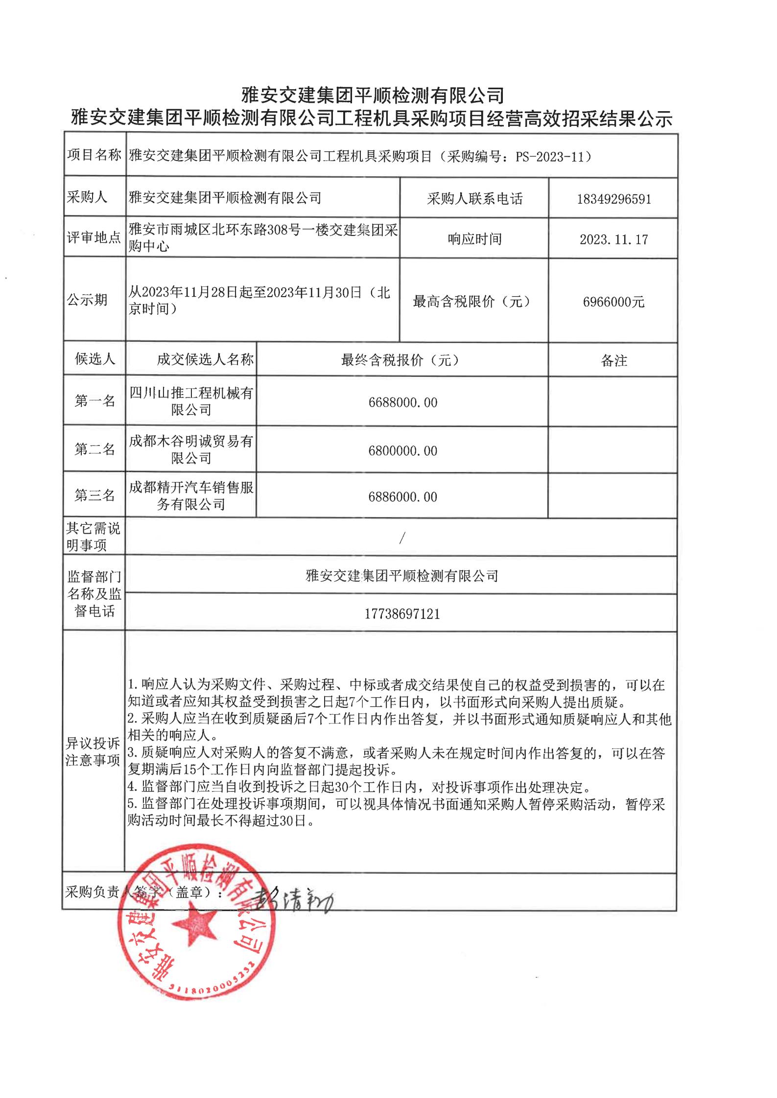 雅安交建集團(tuán)平順檢測(cè)有限公司工程機(jī)具采購項(xiàng)目經(jīng)營高效招采結(jié)果公示