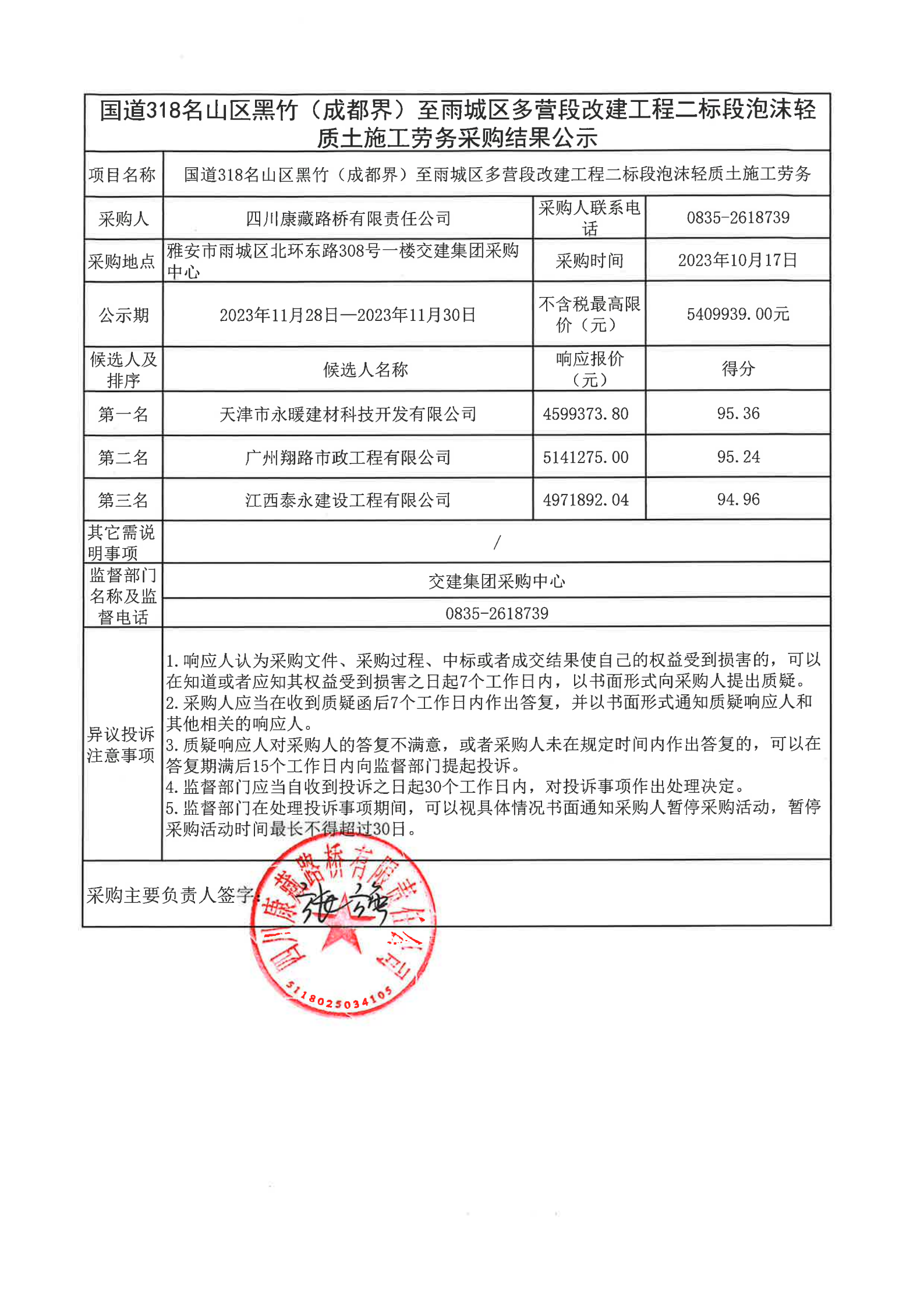 四川康藏路橋有限責任公司國道318名山區(qū)黑竹(成都界)至雨城區(qū)多營段改建工程二標段泡沫輕質(zhì)土施工勞務(wù)采購結(jié)果公示