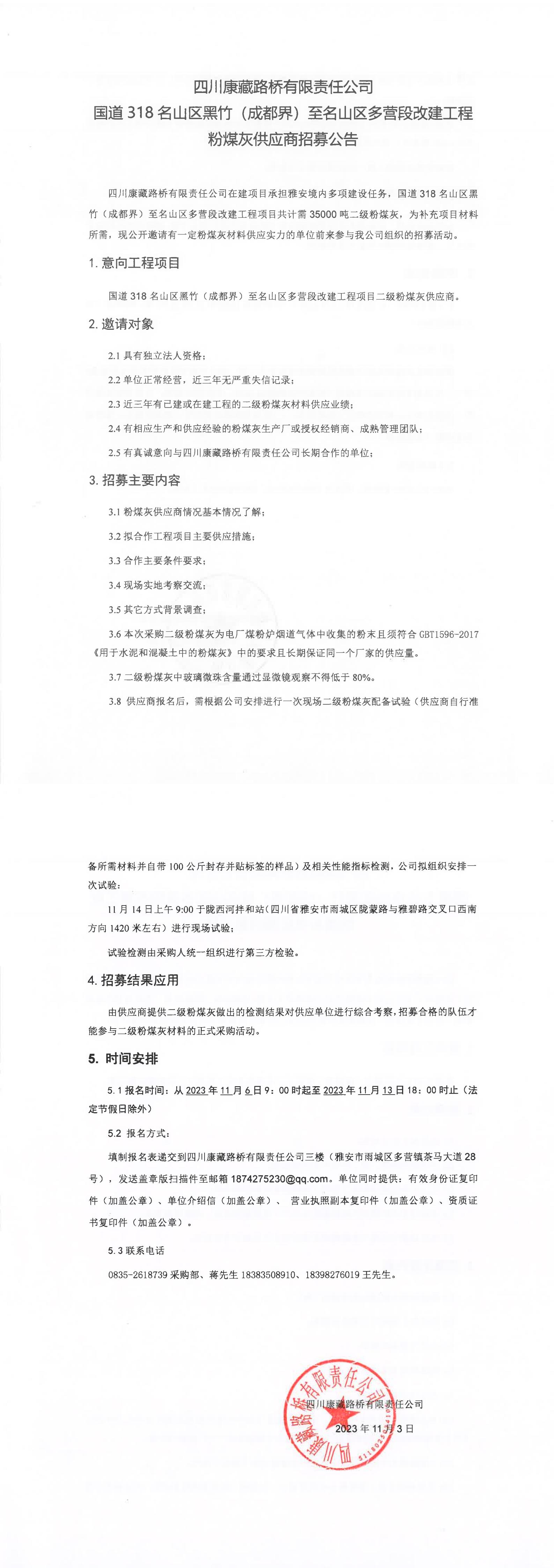 四川康藏路橋有限責(zé)任公司國(guó)道318名山區(qū)黑竹(成都界)至名山區(qū)多營(yíng)段改建工程粉煤灰供應(yīng)商招募公告
