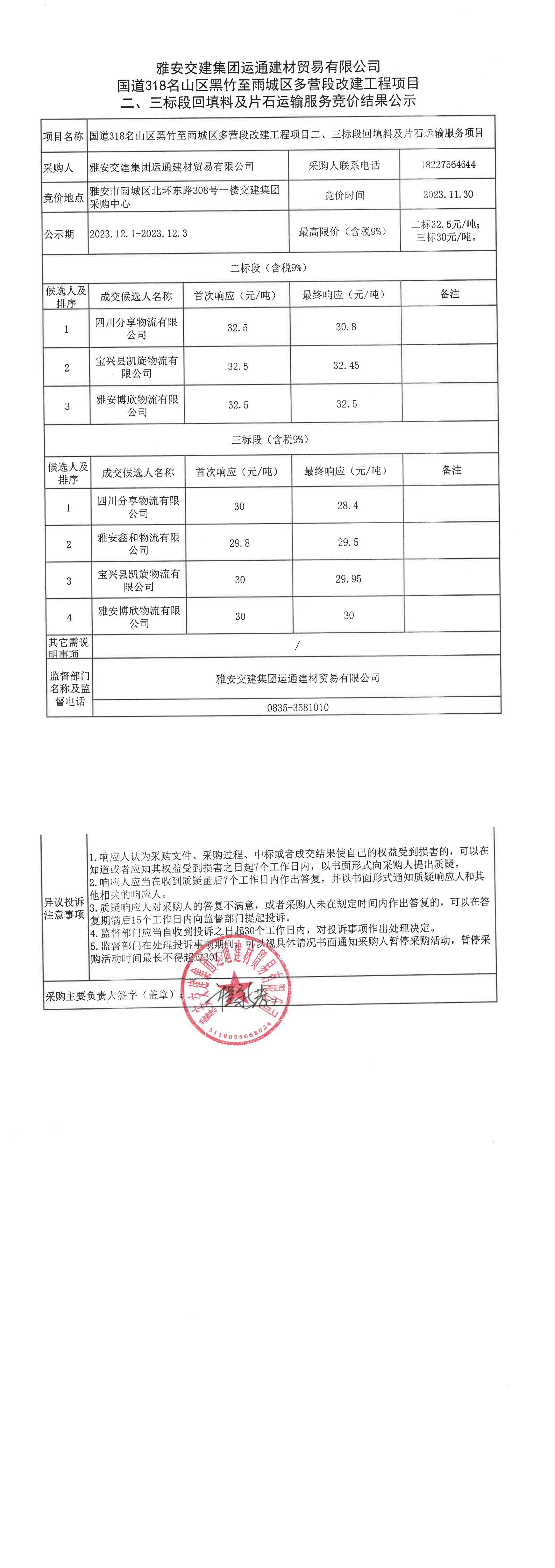 雅安交建集團(tuán)運(yùn)通建材貿(mào)易有限公司國(guó)道318名山區(qū)黑竹至雨城區(qū)多營(yíng)段改建工程項(xiàng)目二、三標(biāo)段回填料、片石運(yùn)輸服務(wù)競(jìng)價(jià)結(jié)果公示