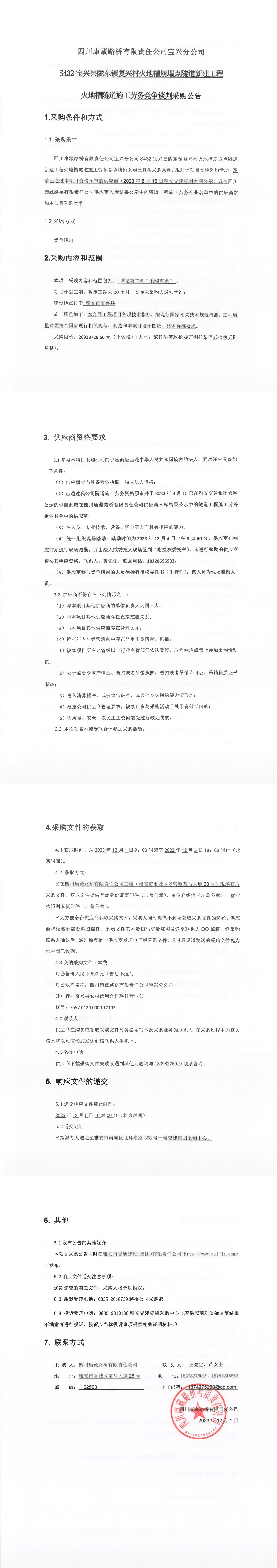 四川康藏路橋有限責(zé)任公司寶興分公司S432寶興縣隴東鎮(zhèn)復(fù)興村火地槽崩塌點(diǎn)隧道新建工程火地槽隧道施工勞務(wù)競(jìng)爭(zhēng)談判采購公告