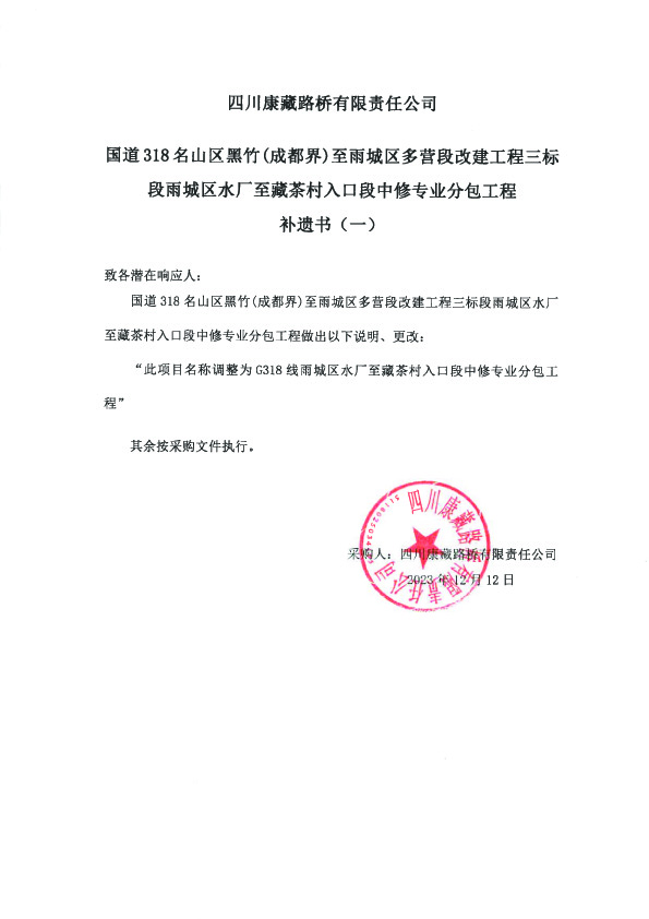 四川康藏路橋有限責(zé)任公司國(guó)道318名山區(qū)黑竹(成都界)至雨城區(qū)多營(yíng)段改建工程三標(biāo)段雨城區(qū)水廠至藏茶村入口段中修專業(yè)分包工程(補(bǔ)遺書(shū)一)