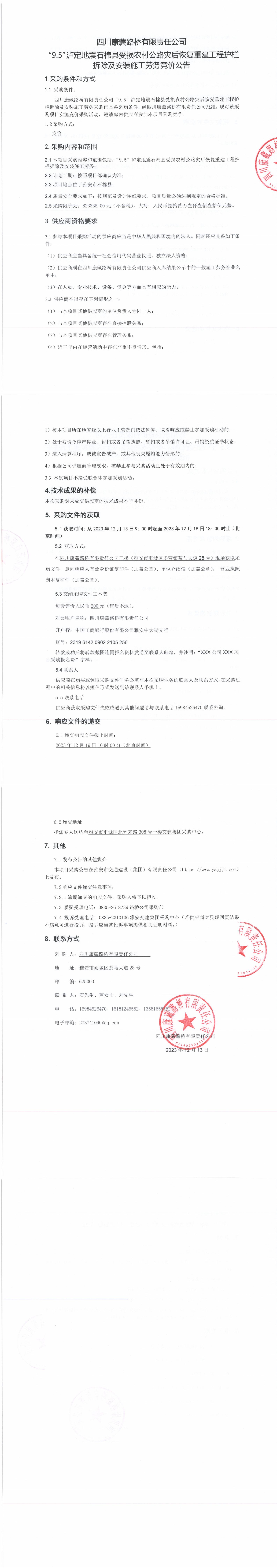 四川康藏路橋有限責(zé)任公司“9.5”瀘定地震石棉縣受損農(nóng)村公路災(zāi)后恢復(fù)重建工程護(hù)欄拆除及安裝施工勞務(wù)競價公告