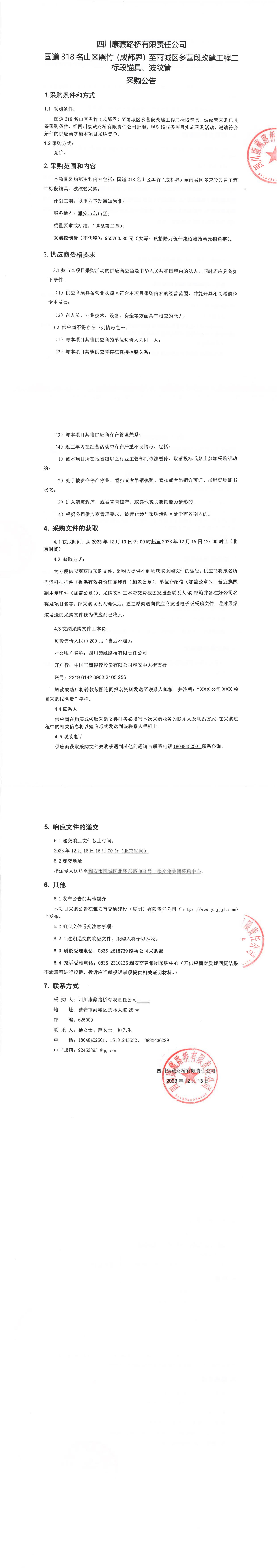 四川康藏路橋有限責(zé)任公司國道318名山區(qū)黑竹(成都界)至雨城區(qū)多營段改建工程二標段錨具、波紋管采購公告