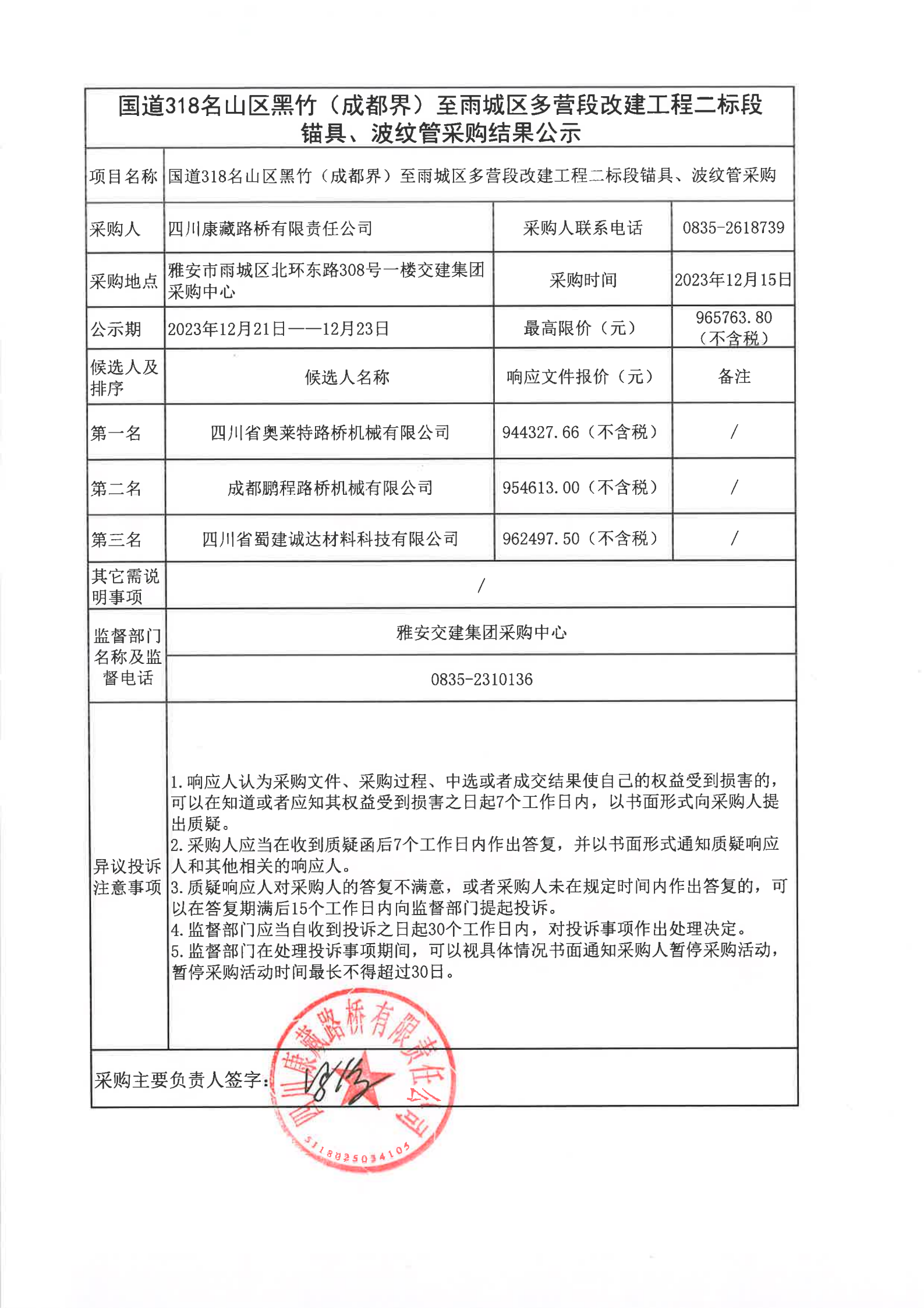 四川康藏路橋有限責(zé)任公司國道318名山區(qū)黑竹(成都界)至雨城區(qū)多營(yíng)段改建工程二標(biāo)段錨具、波紋管采購結(jié)果公示