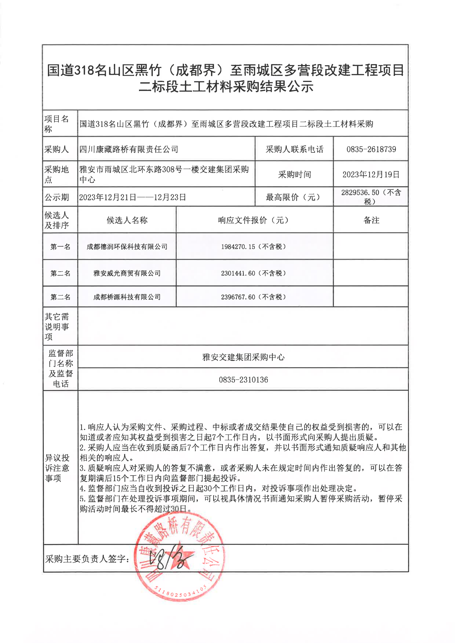 四川康藏路橋有限責任公司國道318名山區(qū)黑竹(成都界)至雨城區(qū)多營段改建工程項目二標段土工材料采購結(jié)果公示
