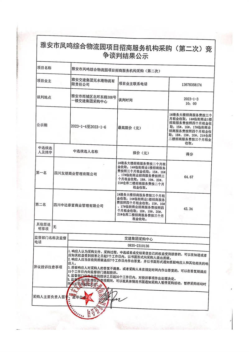 雅安交建集團(tuán)無水港物流有限責(zé)任公司雅安市鳳鳴綜合物流園項目招商服務(wù)機構(gòu)采購(第二次)競爭談判結(jié)果公示