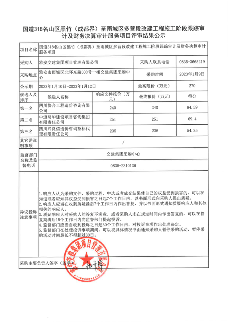 雅安交建集團項目管理有限公司國道318名山區(qū)黑竹(成都界)至雨城區(qū)多營段改建工程施工階段跟蹤審計及財務決算審計服務項目評審結果公示