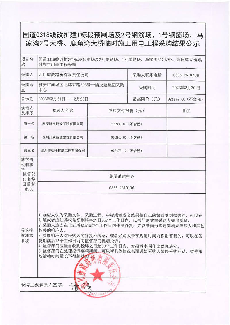 四川康藏路橋有限責(zé)任公司國道318線改擴(kuò)建1標(biāo)段預(yù)制場及2號(hào)鋼筋場、1號(hào)鋼筋場、馬家溝2號(hào)大橋、鹿角灣大橋臨時(shí)施工用電工程采購結(jié)果公示