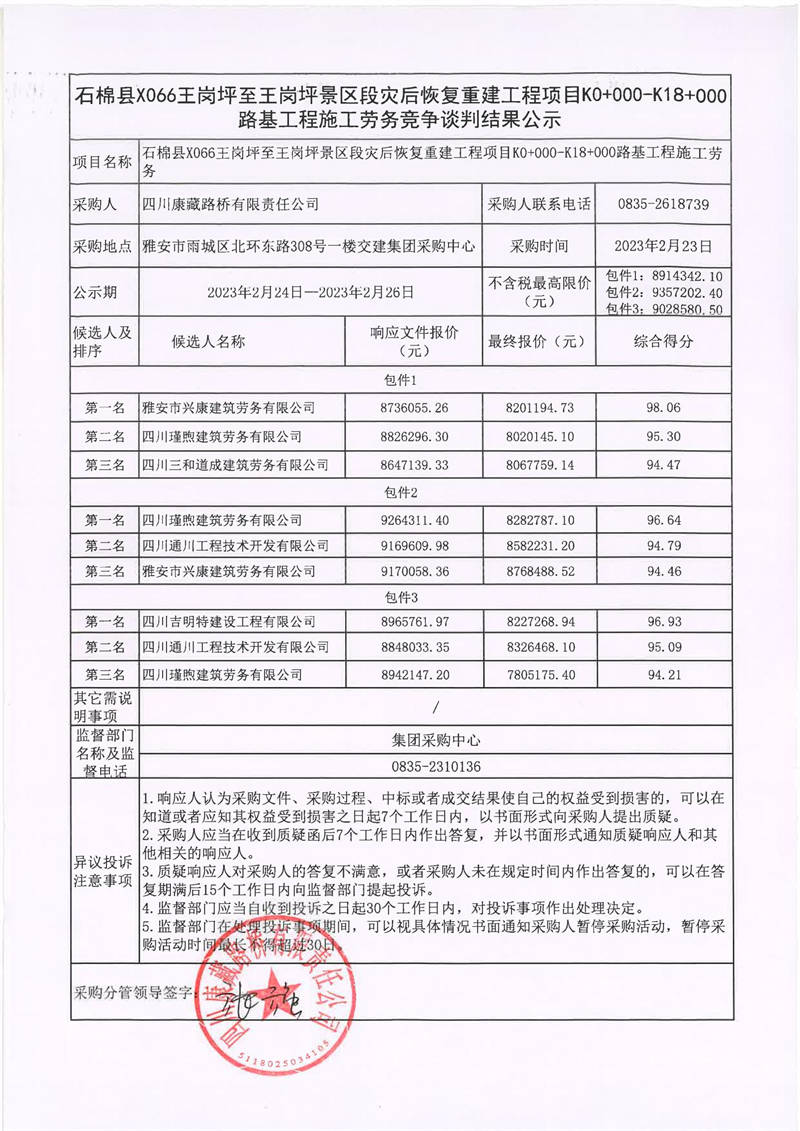 四川康藏路橋有限責(zé)任公司石棉縣X066王崗坪至王崗坪景區(qū)段災(zāi)后恢復(fù)重建工程項目土石方工程、排水工程、邊坡治理工程、防護(hù)工程施工勞務(wù)采購項目競爭談判結(jié)果公示