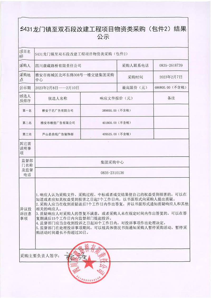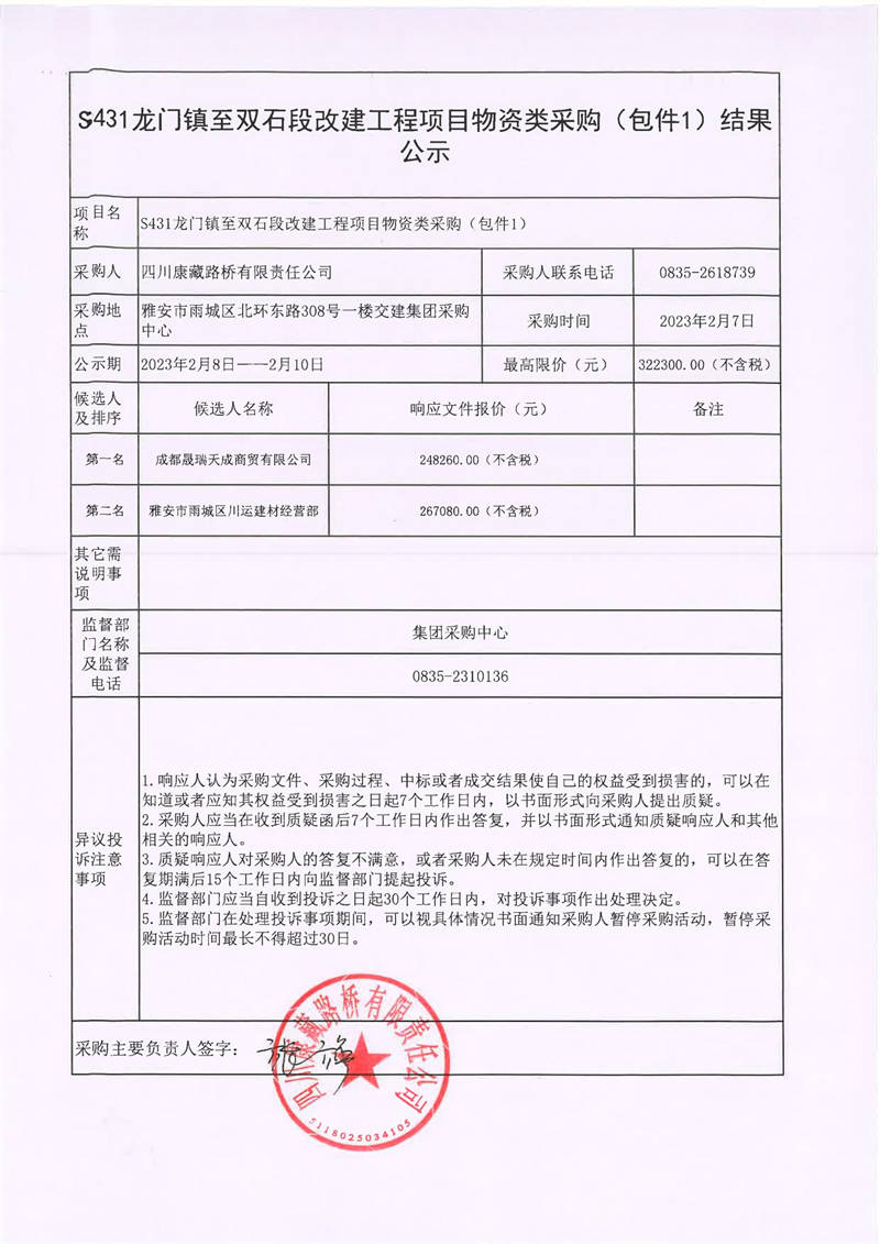 四川康藏路橋有限責任公司S431龍門鎮(zhèn)至雙石段改建工程項目物資類采購(包件1、包件2)結(jié)果公示