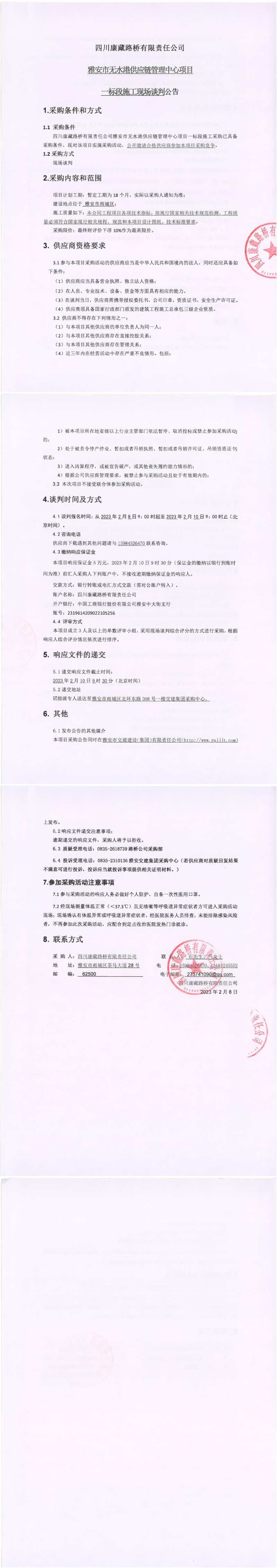 四川康藏路橋有限責(zé)任公司雅安市無水港供應(yīng)鏈管理中心項目一標(biāo)段施工現(xiàn)場談判公告