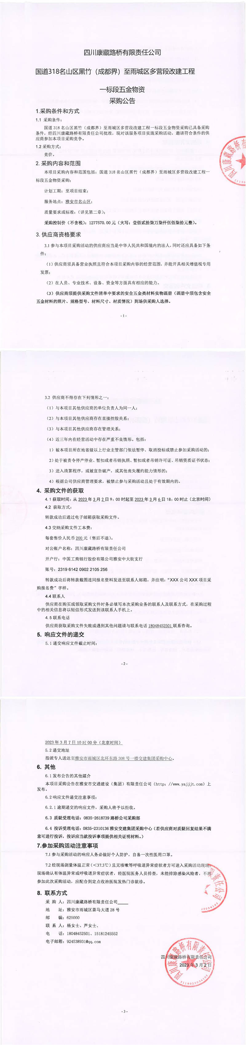 四川康藏路橋有限責(zé)任公司國道318名山區(qū)黑竹(成都界)至雨城區(qū)多營段改建工程一標(biāo)段五金物資采購公告