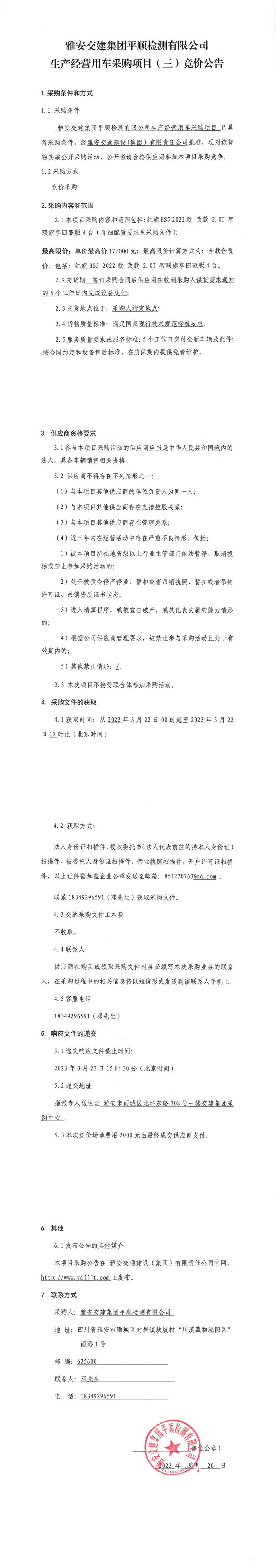 雅安交建集團(tuán)平順檢測有限公司平順公司生產(chǎn)經(jīng)營用車采購項目(三)競價公告