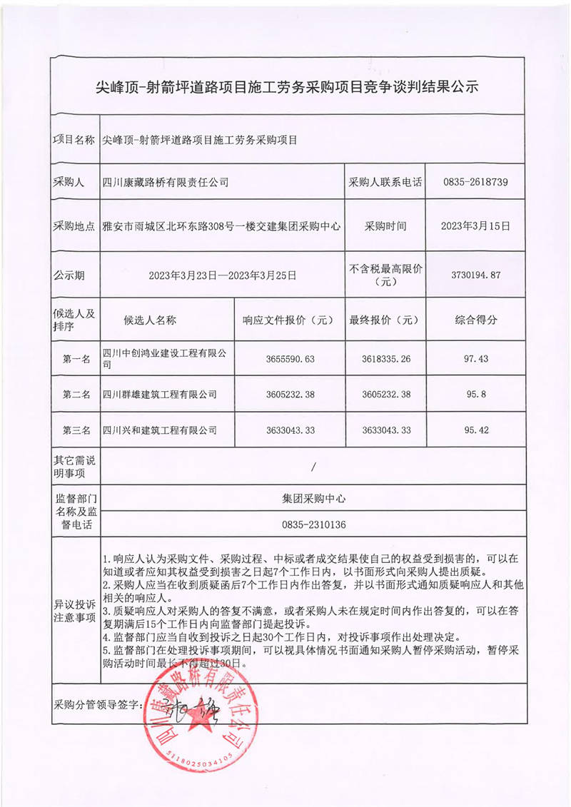 四川康藏路橋有限責任公司尖峰頂-射箭坪道路項目施工勞務(wù)采購項目競爭談判結(jié)果公示