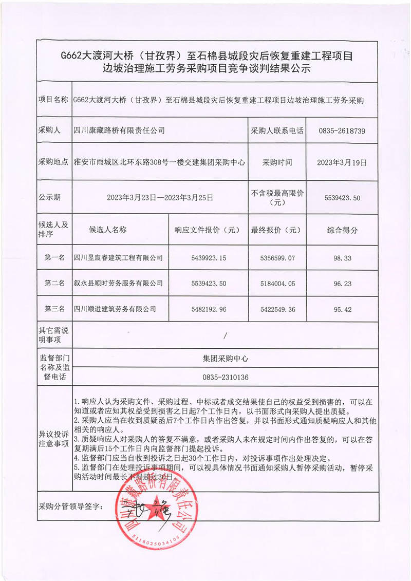 四川康藏路橋有限責任公司G662大渡河大橋(甘孜界)至石棉縣城段災后恢復重建工程項目邊坡治理施工勞務(wù)采購項目競爭談判結(jié)果公示