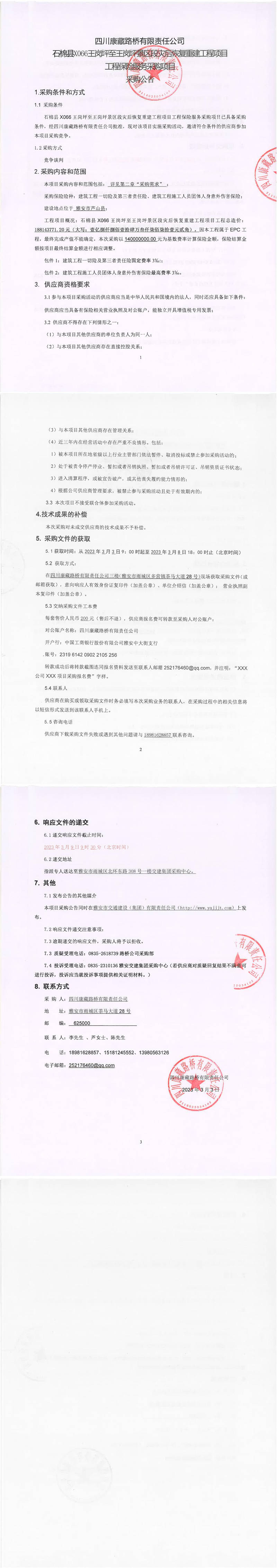 四川康藏路橋有限責(zé)任公司石棉縣X066王崗坪至王崗坪景區(qū)段災(zāi)后恢復(fù)重建工程項(xiàng)目工程保險(xiǎn)服務(wù)采購公告
