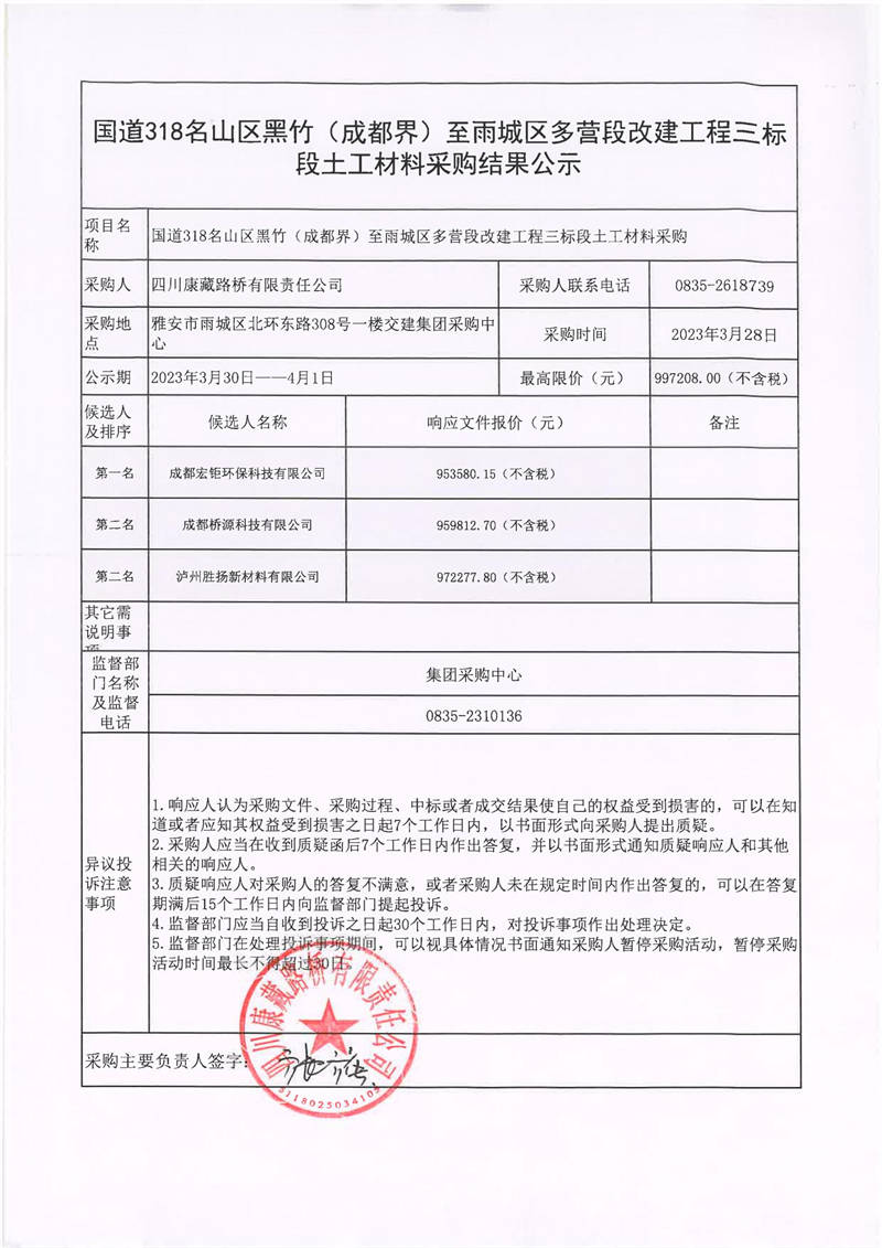 四川康藏路橋有限責(zé)任公司國(guó)道318名山區(qū)黑竹(成都界)至雨城區(qū)多營(yíng)段改建工程三標(biāo)段土工材料采購結(jié)果公示