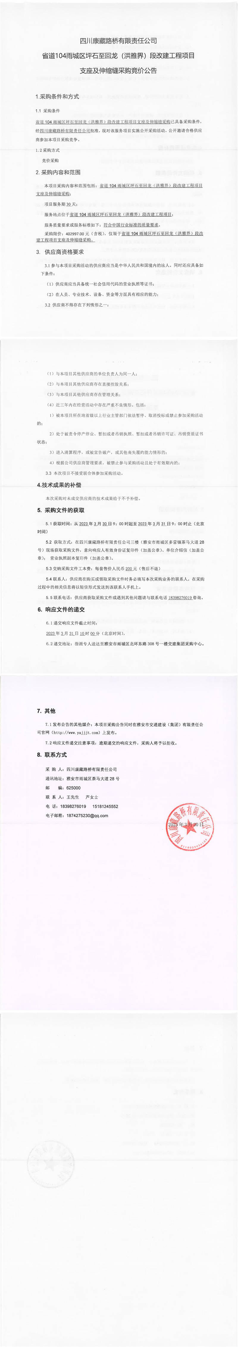 四川康藏路橋有限責(zé)任公司省道104雨城區(qū)坪石至回龍(洪雅界)段改建工程項(xiàng)目支座及伸縮縫采購競價(jià)公告