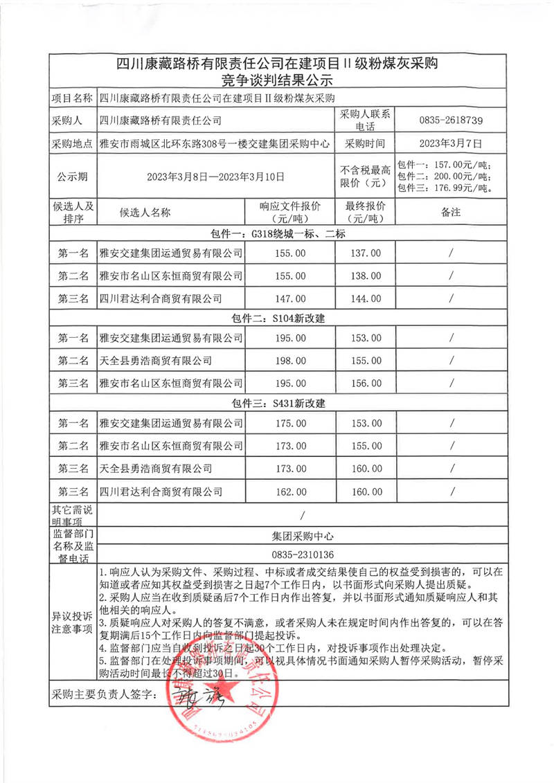 四川康藏路橋有限責(zé)任公司在建項目II級粉煤灰采購競爭談判結(jié)果公示