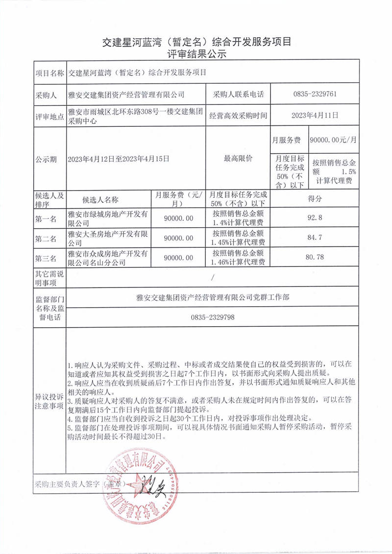 雅安交建集團資產(chǎn)經(jīng)營管理有限公司交建星河藍灣(暫定名)綜合開發(fā)服務項目評審結(jié)果公示