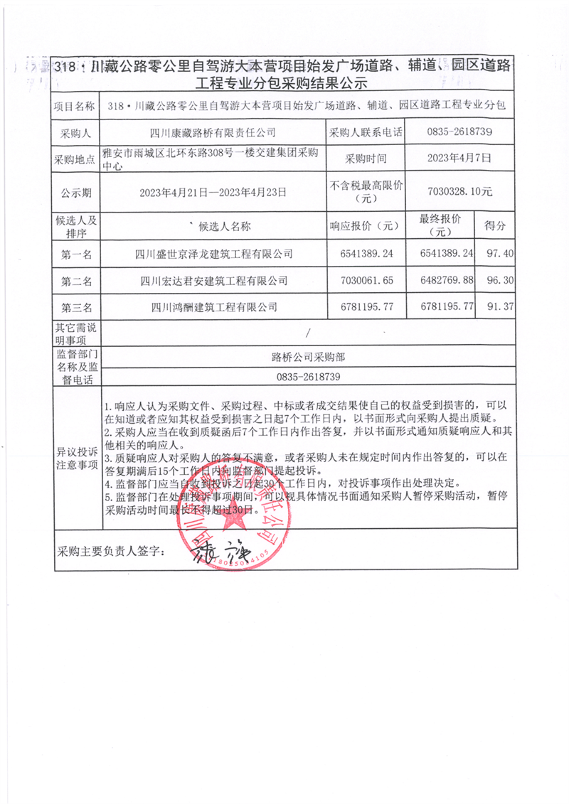 四川康藏路橋有限責(zé)任公司318·川藏公路零公里自駕游大本營(yíng)項(xiàng)目始發(fā)廣場(chǎng)道路、輔道、園區(qū)道路工程專業(yè)分包采購(gòu)結(jié)果公示