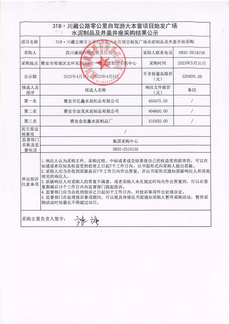 四川康藏路橋有限責(zé)任公司318·川藏公路零公里自駕游大本營項(xiàng)目始發(fā)廣場水泥制品及井蓋井座采購結(jié)果公示
