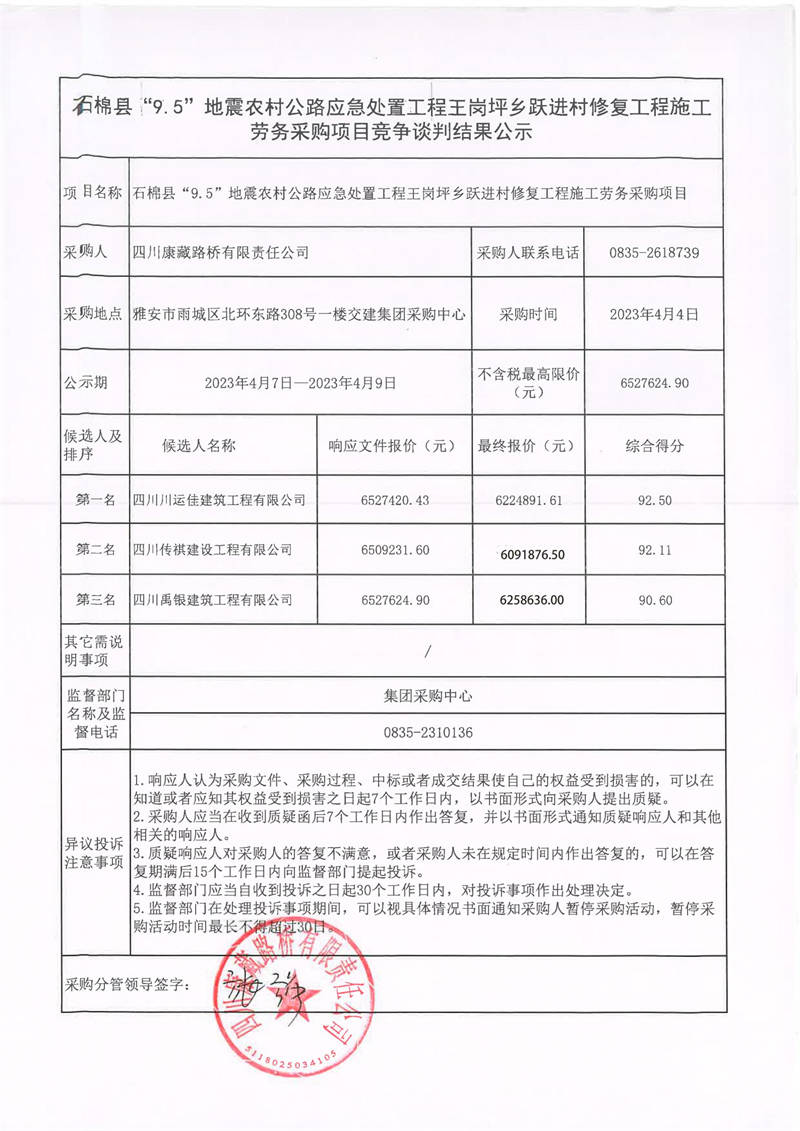 四川康藏路橋有限責(zé)任公司石棉縣“9.5”地震農(nóng)村公路應(yīng)急處置工程王崗坪鄉(xiāng)躍進(jìn)村修復(fù)工程施工勞務(wù)采購項(xiàng)目競(jìng)爭(zhēng)談判結(jié)果公示