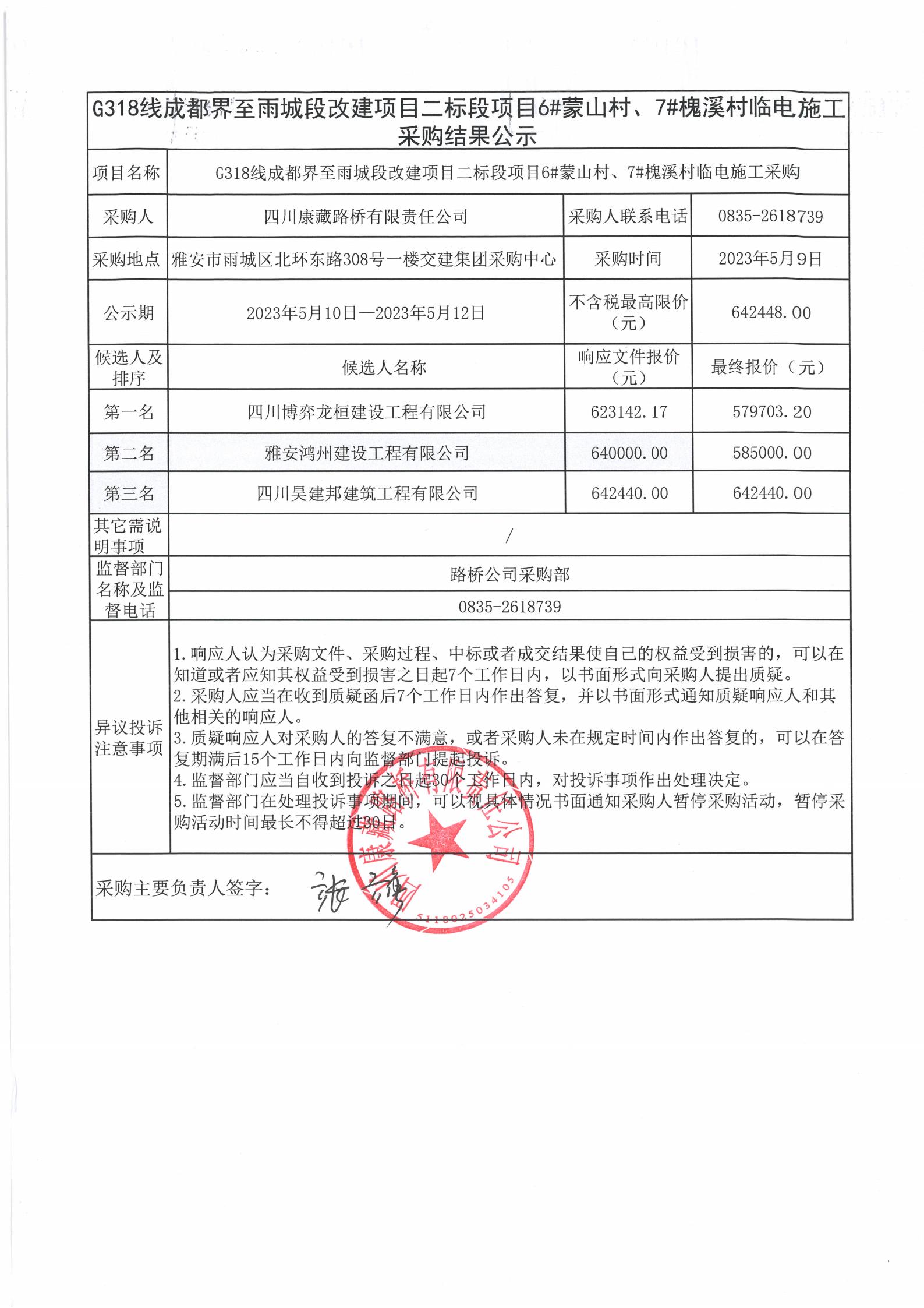 四川康藏路橋有限責任公司G318線成都至雨城段改建項目二標段項目6#蒙山村、7#槐溪村臨時電施工采購結(jié)果公示