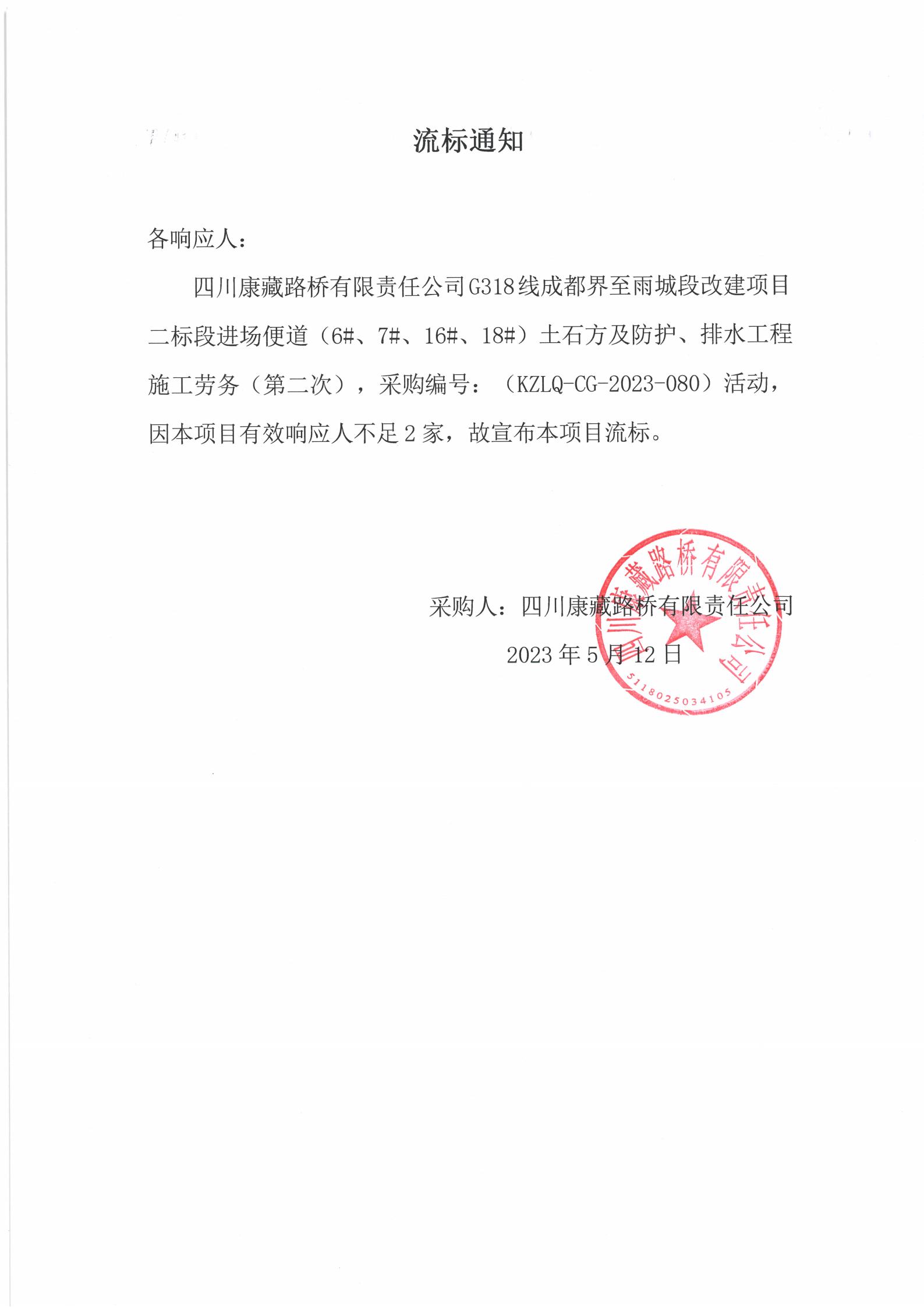 四川康藏路橋有限責(zé)任公司G318線(xiàn)成都至雨城段改建項(xiàng)目二標(biāo)段進(jìn)場(chǎng)便道(6#、7#、16#、18#)土石方及防護(hù)、排水工程施工勞務(wù)(第二次)流標(biāo)通知