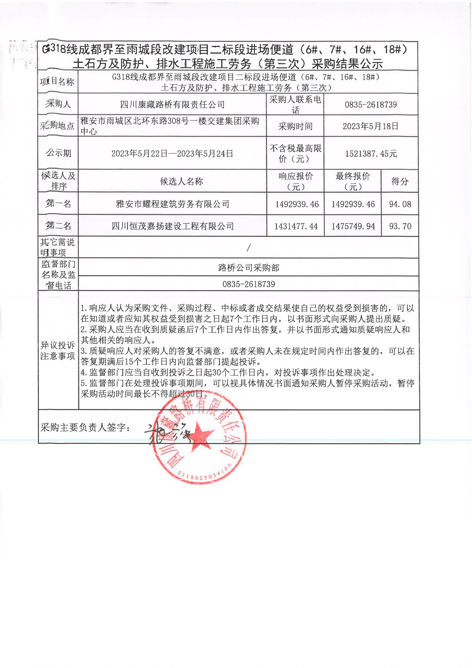 四川康藏路橋有限責任公司G318線成都至雨城段改建項目二標段進場便道(6#、7#、16#、18#)土石方及防護、排水工程施工勞務(第三次)采購結果公示