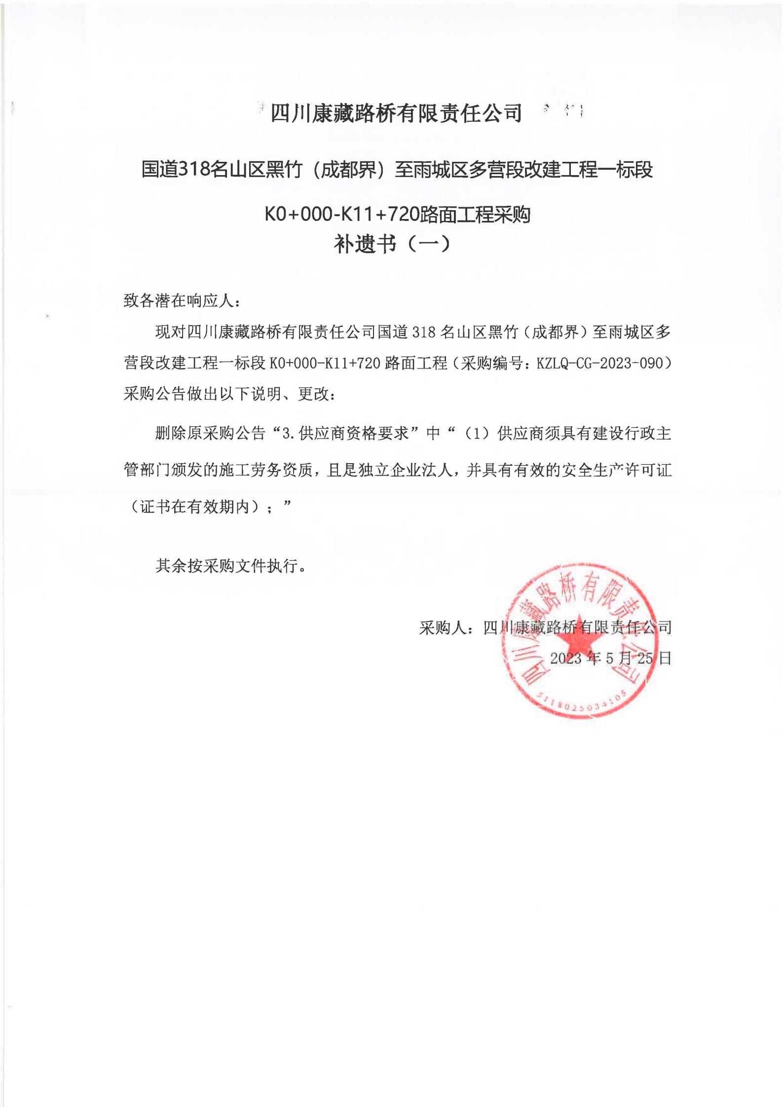 四川康藏路橋有限責(zé)任公司國道318名山區(qū)黑竹(成都界)至雨城區(qū)多營段改建工程一標(biāo)段K0+000-K11+720路面工程采購補(bǔ)遺書(一)