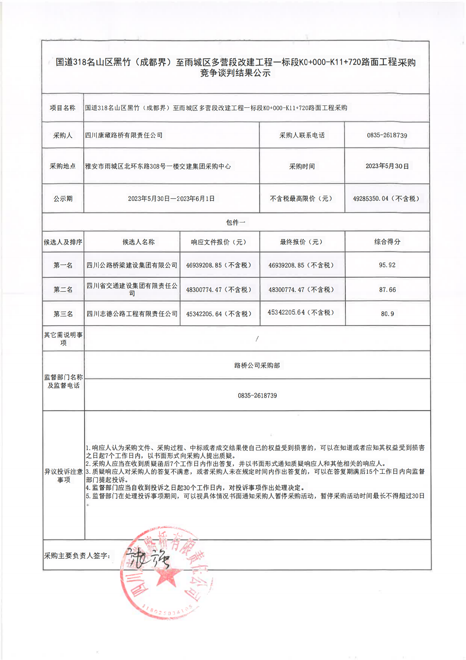 四川康藏路橋有限責(zé)任公司國道318名山區(qū)黑竹(成都界)至雨城區(qū)多營段改建工程一標(biāo)段K0+000-K11+720路面工程采購競爭談判結(jié)果公示