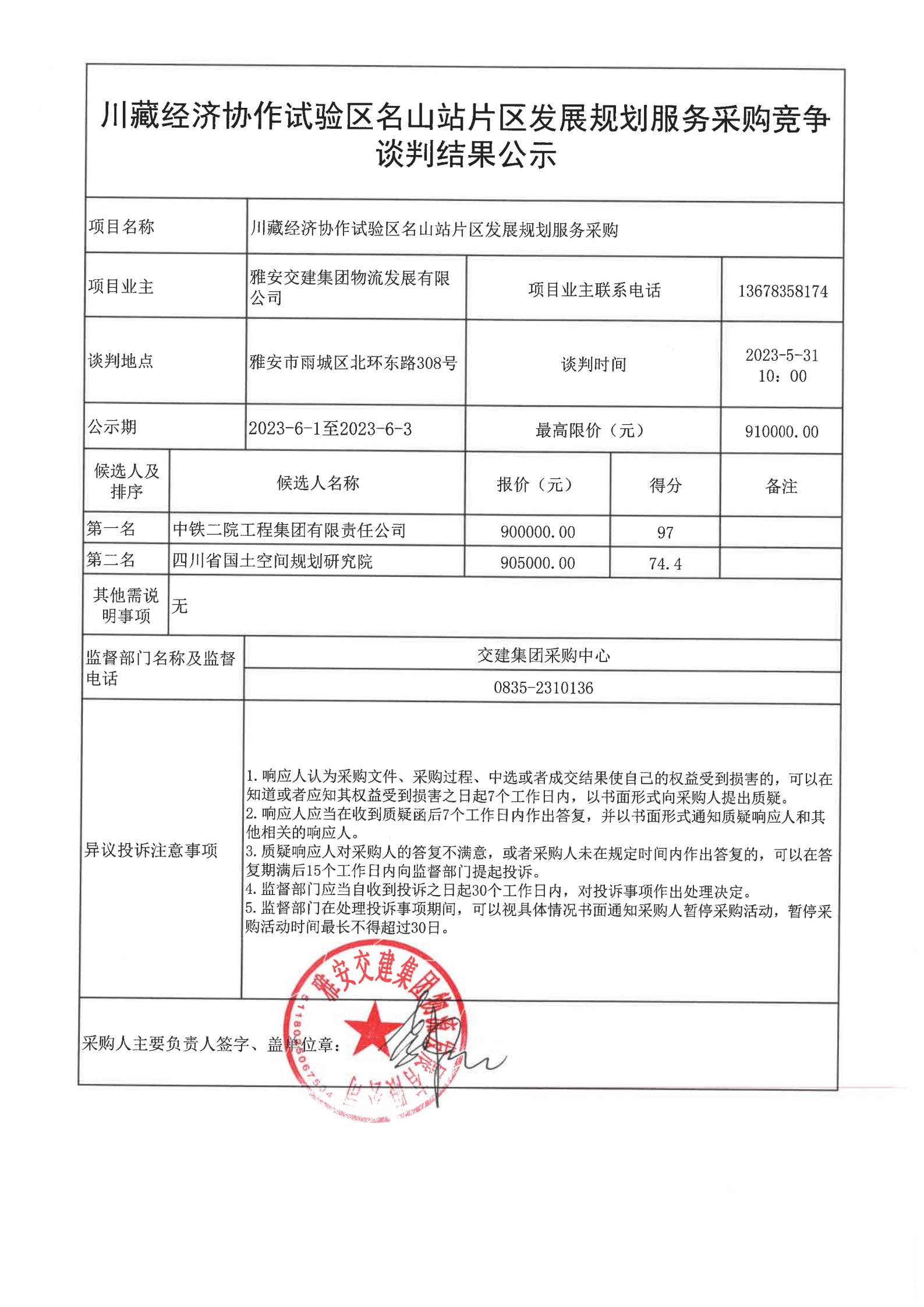 雅安交建集團物流發(fā)展有限公司川藏經濟協(xié)作試驗區(qū)名山站片區(qū)發(fā)展規(guī)劃編制服務采購競爭談判結果公示