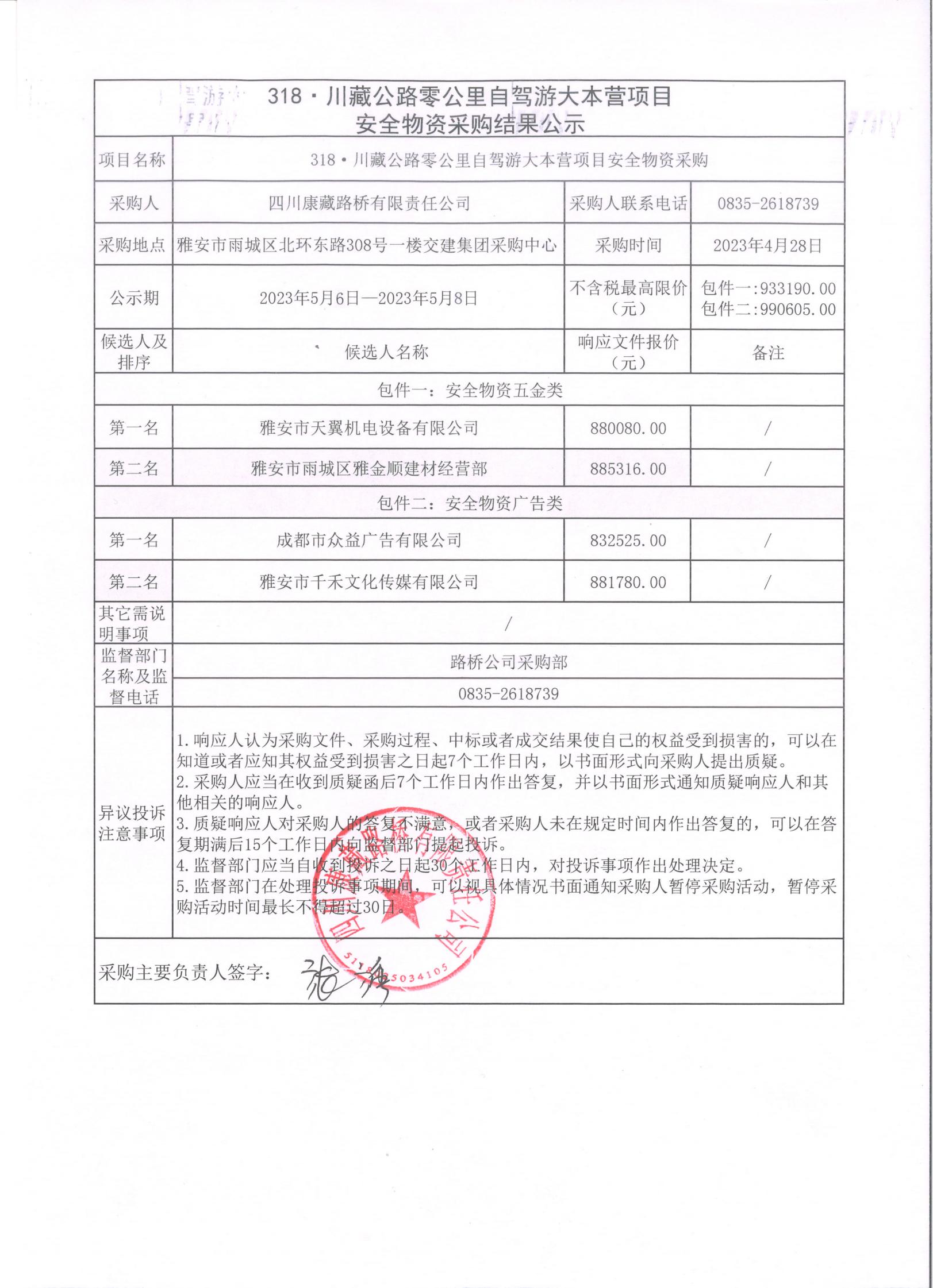 四川康藏路橋有限責(zé)任公司318·川藏公路零公里自駕游大本營項(xiàng)目安全物資采購結(jié)果公示