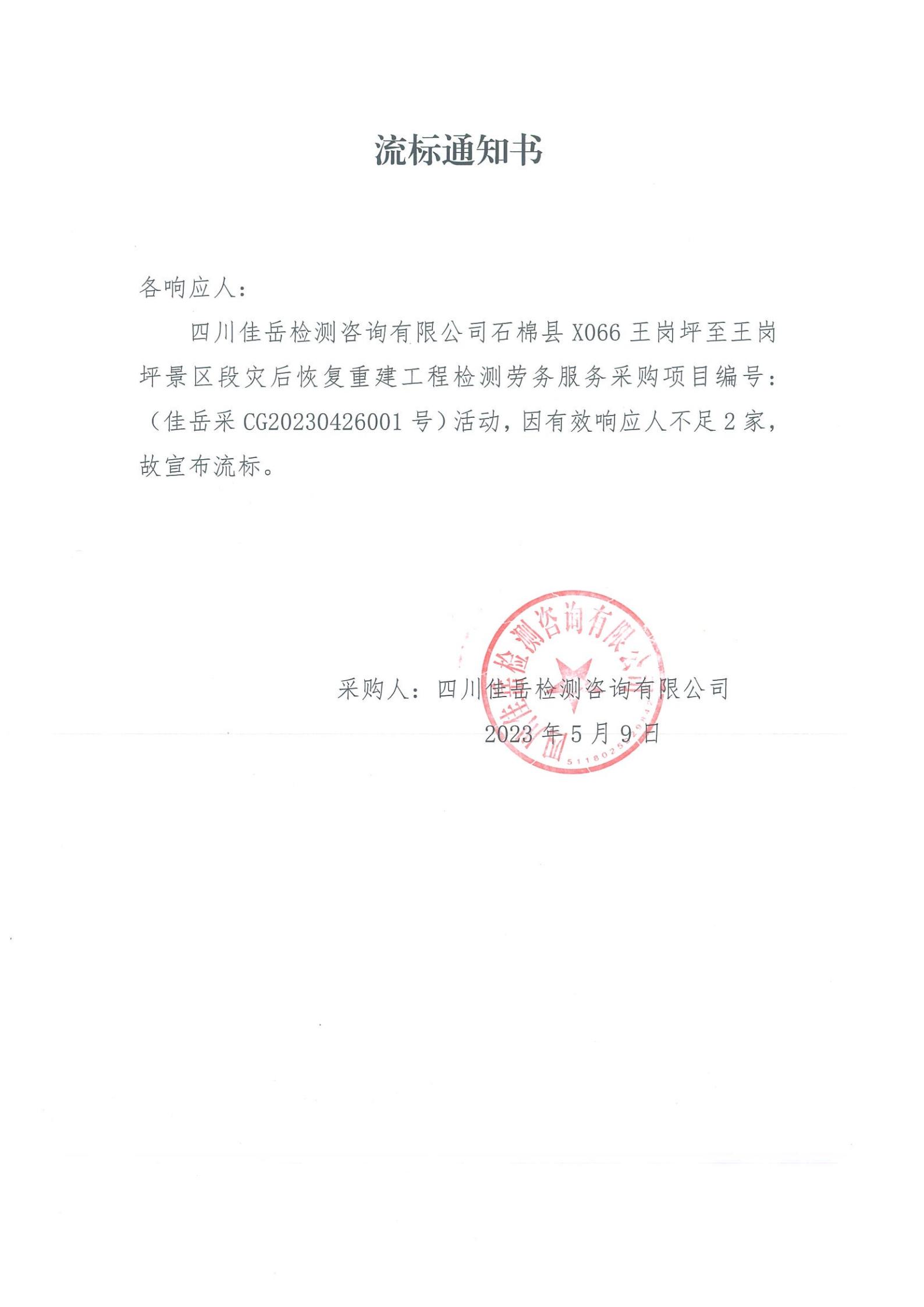 四川佳岳檢測(cè)咨詢(xún)有限公司石棉縣X066王崗坪至王崗坪景區(qū)段災(zāi)后恢復(fù)重建工程檢測(cè)勞務(wù)服務(wù)流標(biāo)通知
