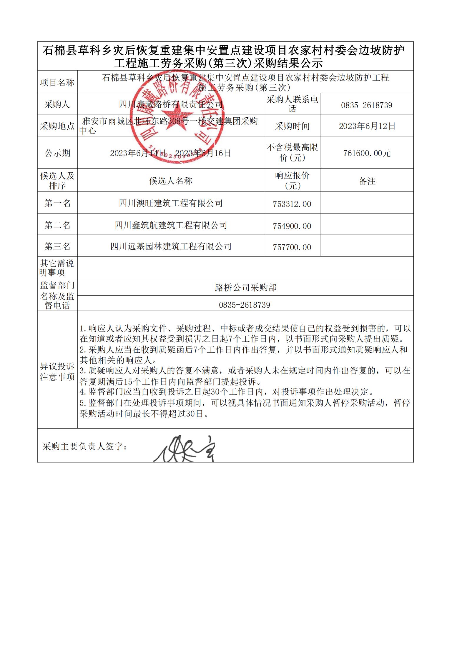 四川康藏路橋有限責(zé)任公司石棉縣草科鄉(xiāng)災(zāi)后恢復(fù)重建集中安置點建設(shè)項目農(nóng)家村村委會邊坡防護工程施工勞務(wù)采購(第三次)結(jié)果公示