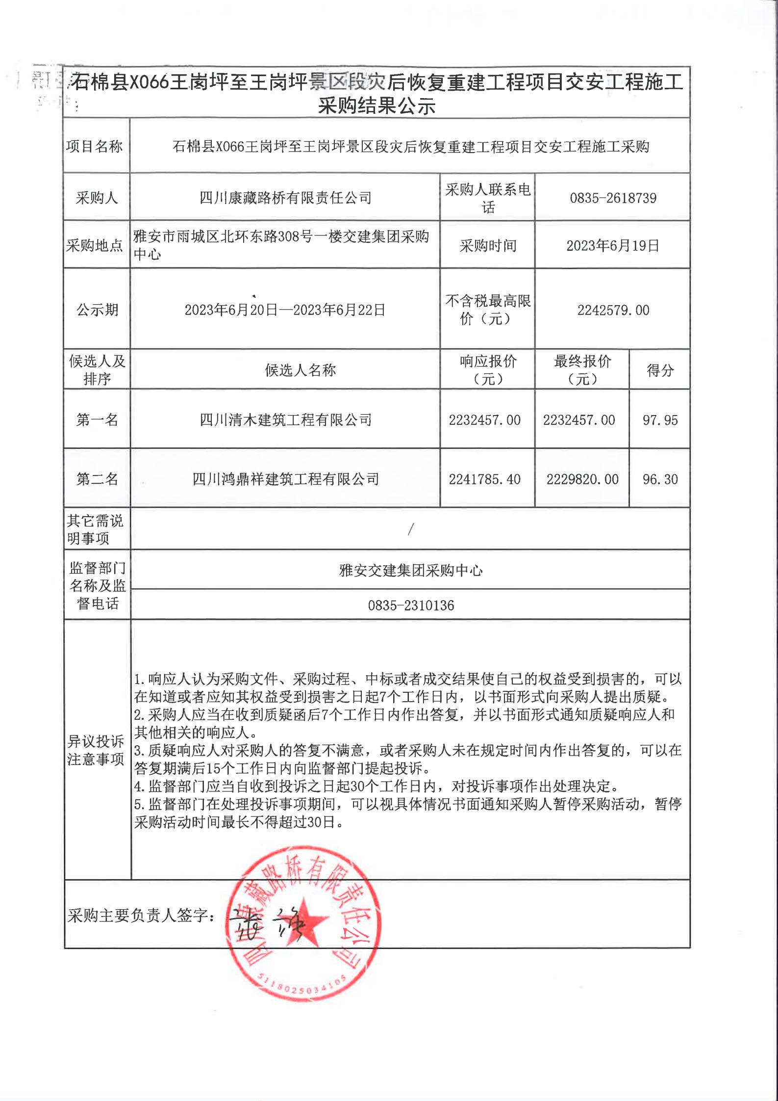 四川康藏路橋有限責任公司石棉縣X066王崗坪至王崗坪景區(qū)段災后恢復重建工程項目交安工程施工采購結果公示