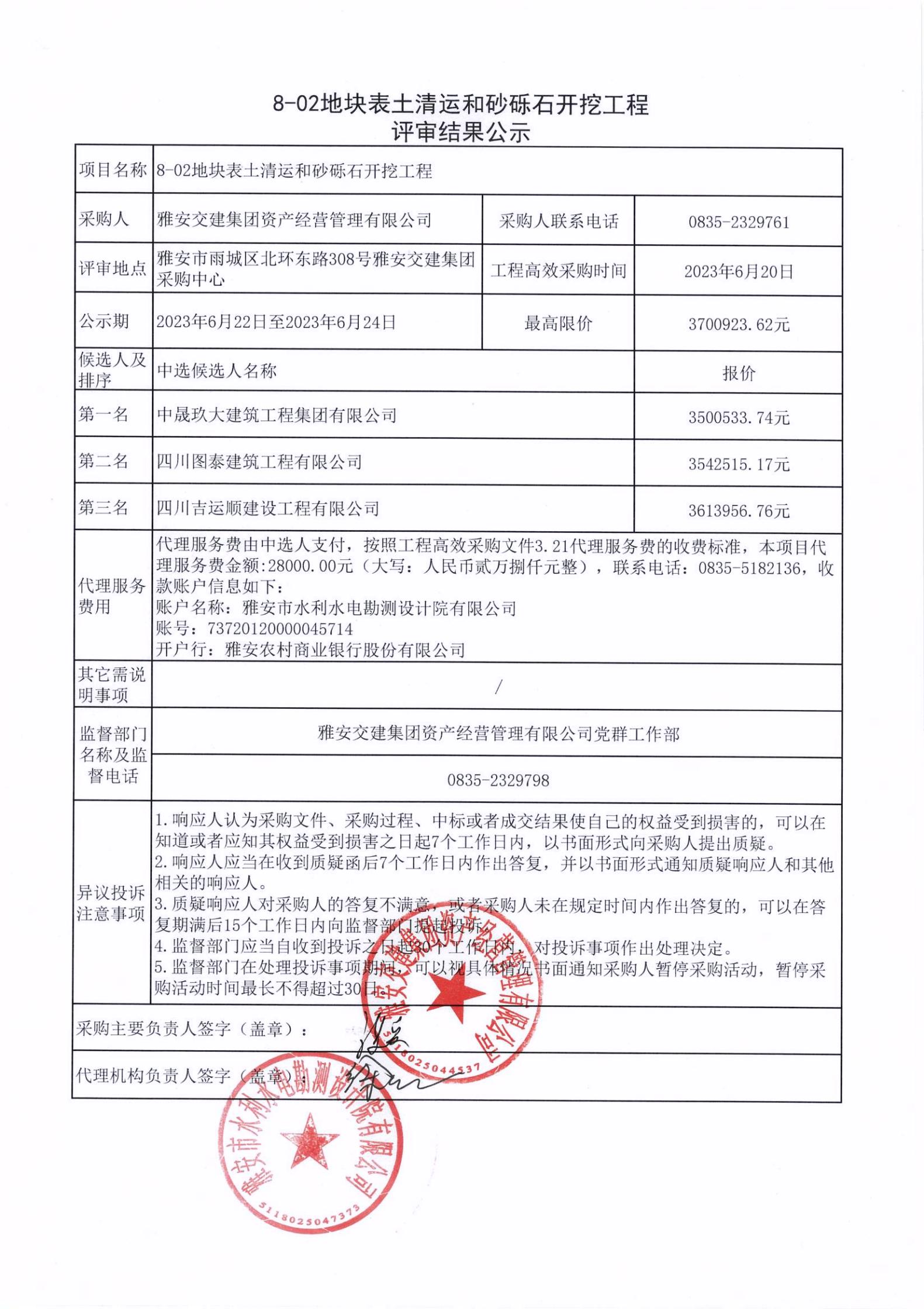 雅安交建集團(tuán)資產(chǎn)經(jīng)營(yíng)管理有限公司8-02地塊表土清運(yùn)和砂礫石開(kāi)挖工程項(xiàng)目評(píng)審結(jié)果公示
