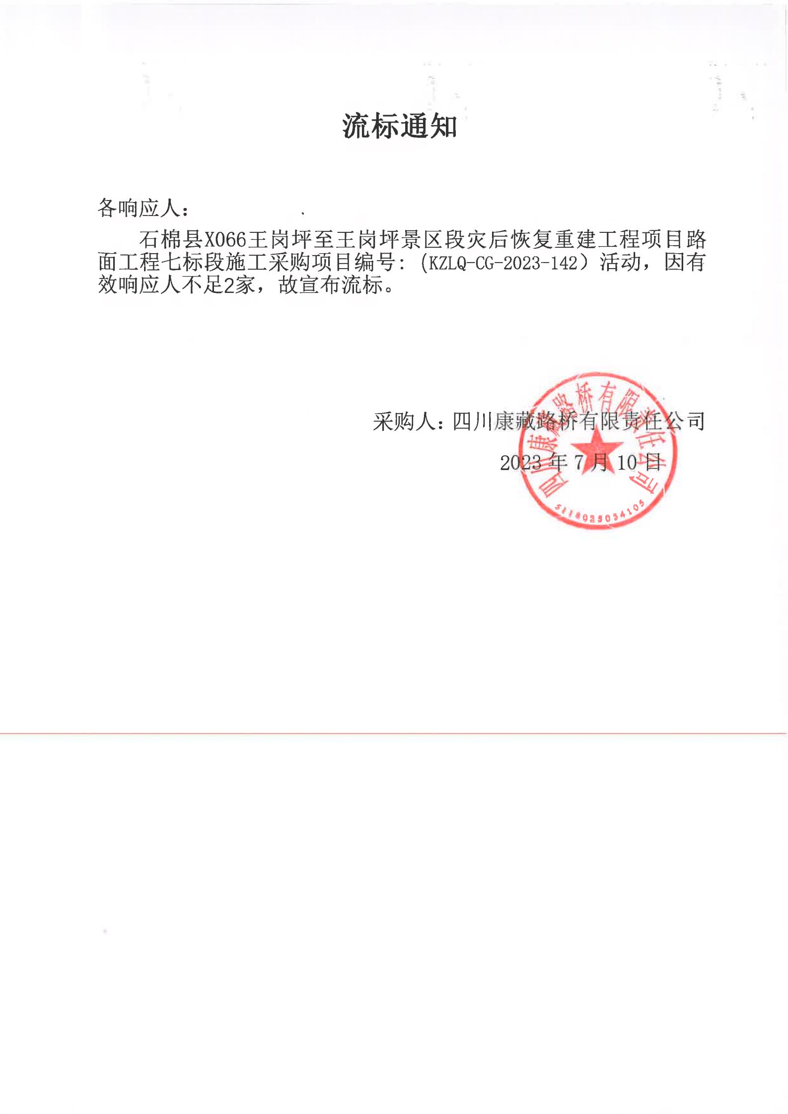 四川康藏路橋有限責(zé)任公司石棉縣X066王崗坪至王崗坪景區(qū)段災(zāi)后恢復(fù)重建工程項目路面工程七標(biāo)段施工采購流標(biāo)通知