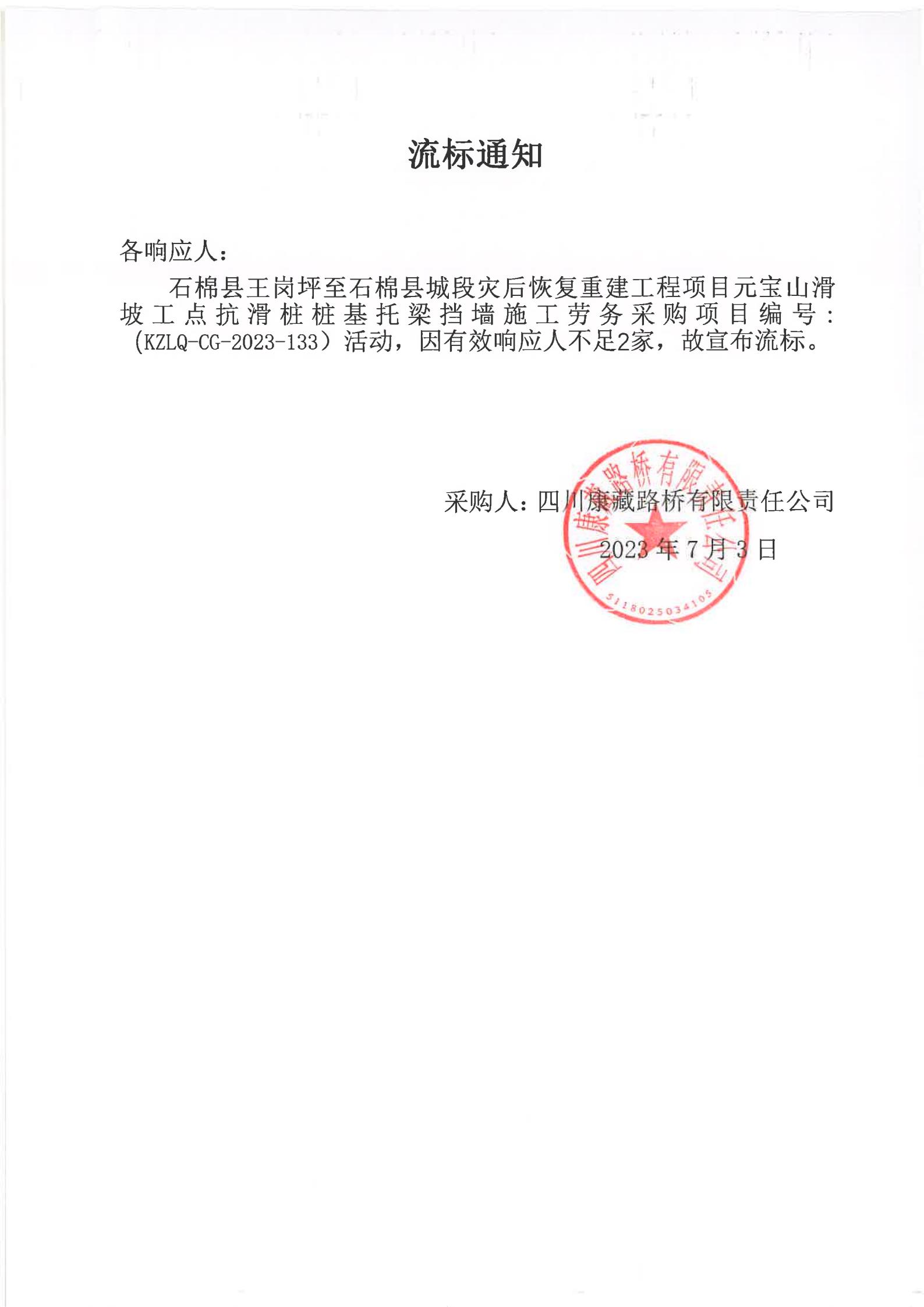 四川康藏路橋有限責(zé)任公司石棉縣王崗坪至石棉縣城段災(zāi)后恢復(fù)重建工程項目元寶山滑坡工點抗滑樁樁基托梁擋墻施工勞務(wù)采購流標(biāo)通知
