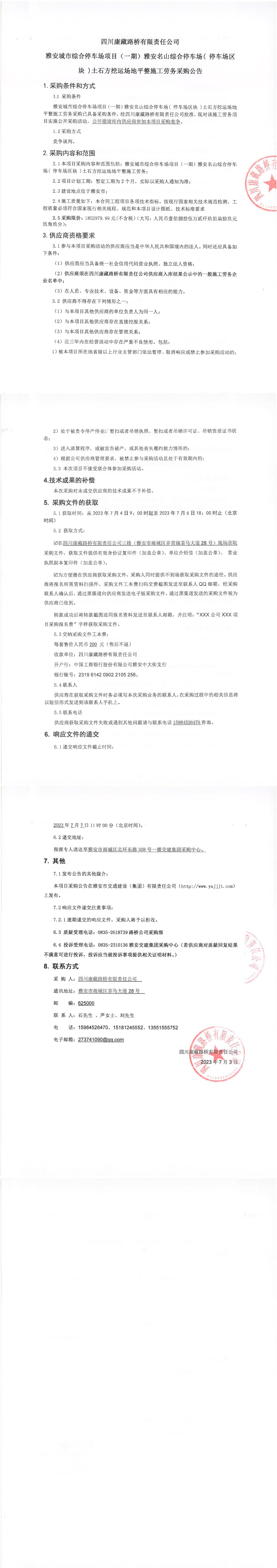 四川康藏路橋有限責(zé)任公司雅安城市綜合停車場項目(一期)雅安名山綜合停車場(停車場區(qū)塊)土石方挖運場地平整施工勞務(wù)采購公告