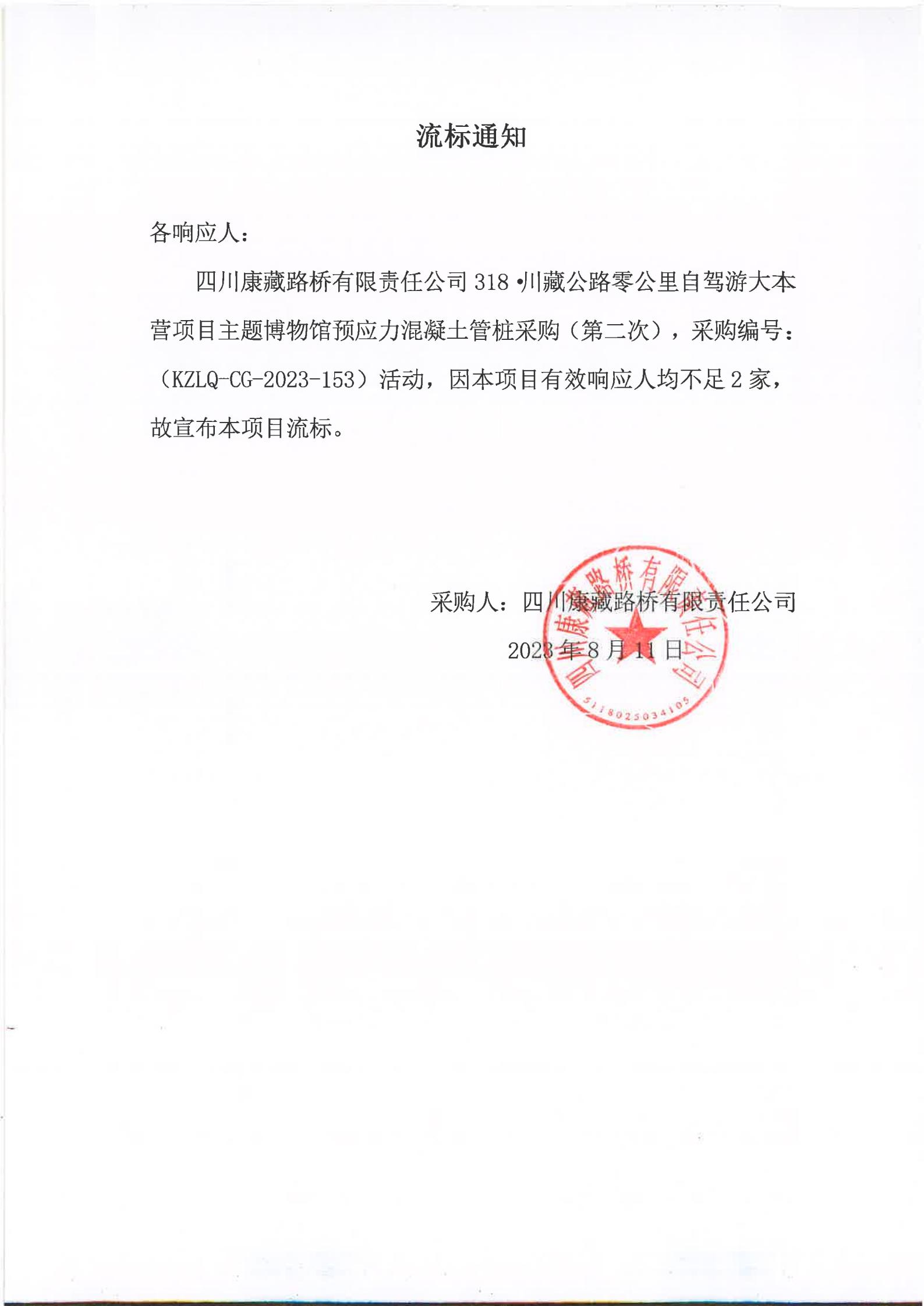 四川康藏路橋有限責(zé)任公司318·川藏公路零公里自駕游大本營項目主題博物館預(yù)應(yīng)力混凝土管樁采購(第二次)流標(biāo)通知