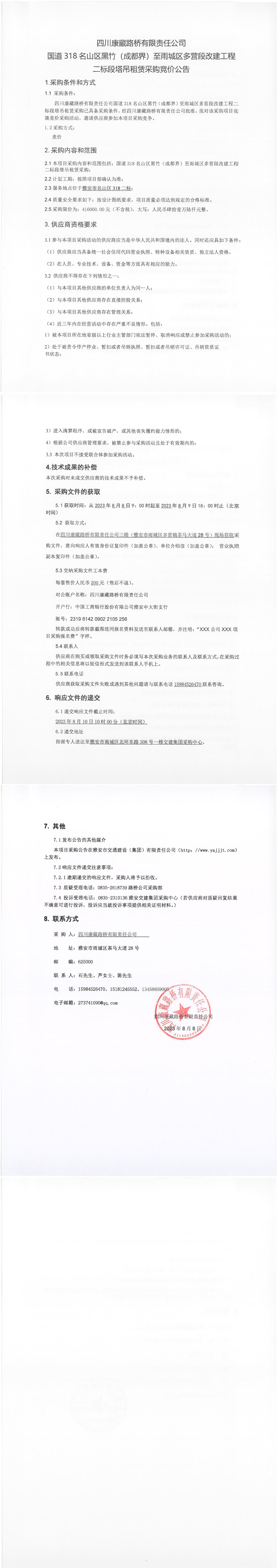 四川康藏路橋有限責(zé)任公司國道318名山區(qū)黑竹(成都界)至雨城區(qū)多營段改建工程二標(biāo)段塔吊租賃采購競(jìng)價(jià)公告