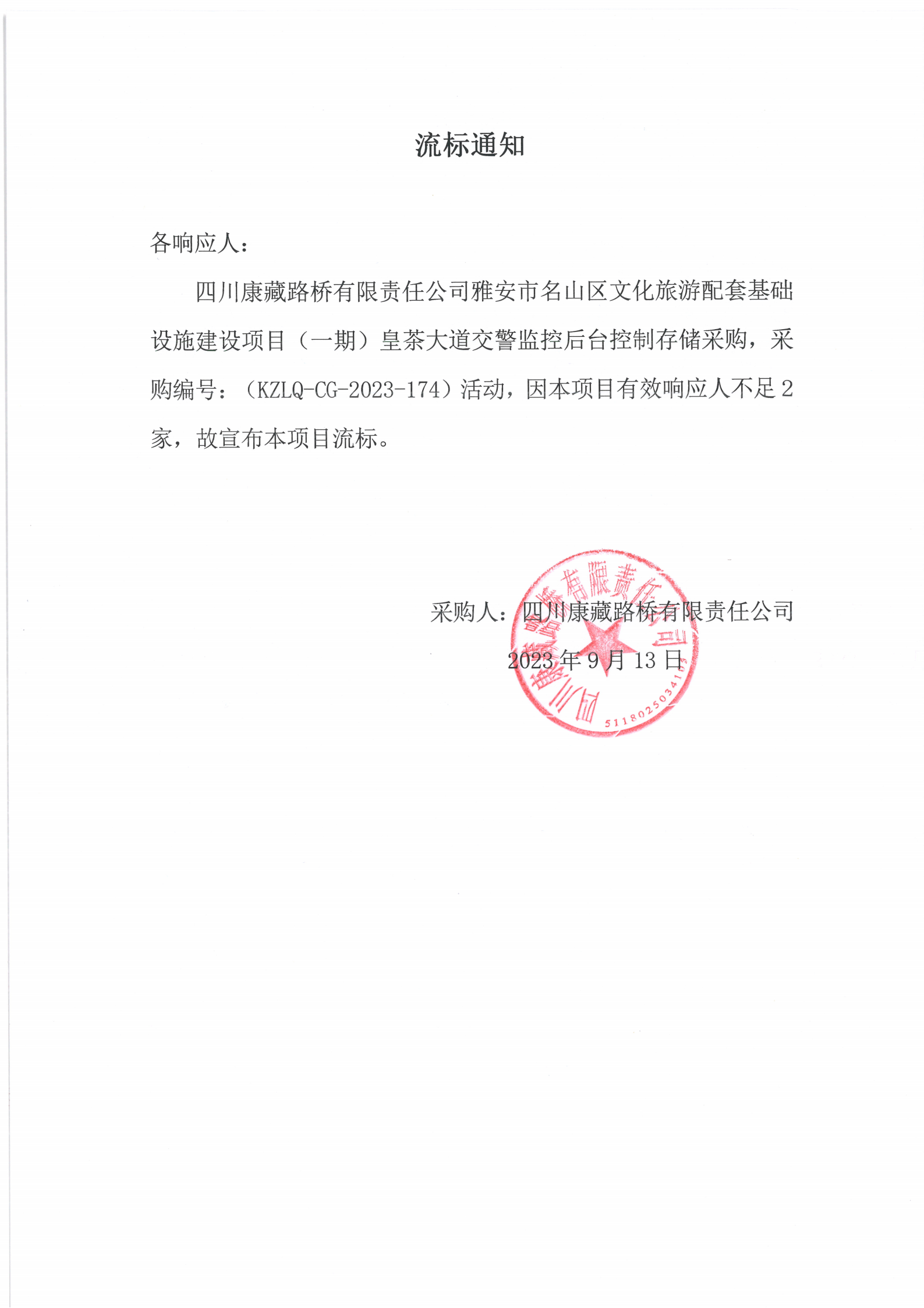 四川康藏路橋有限責(zé)任公司雅安市名山區(qū)文化旅游配套基礎(chǔ)設(shè)施建設(shè)項(xiàng)目(一期)皇茶大道交警監(jiān)控后臺(tái)控制存儲(chǔ)采購流標(biāo)通知