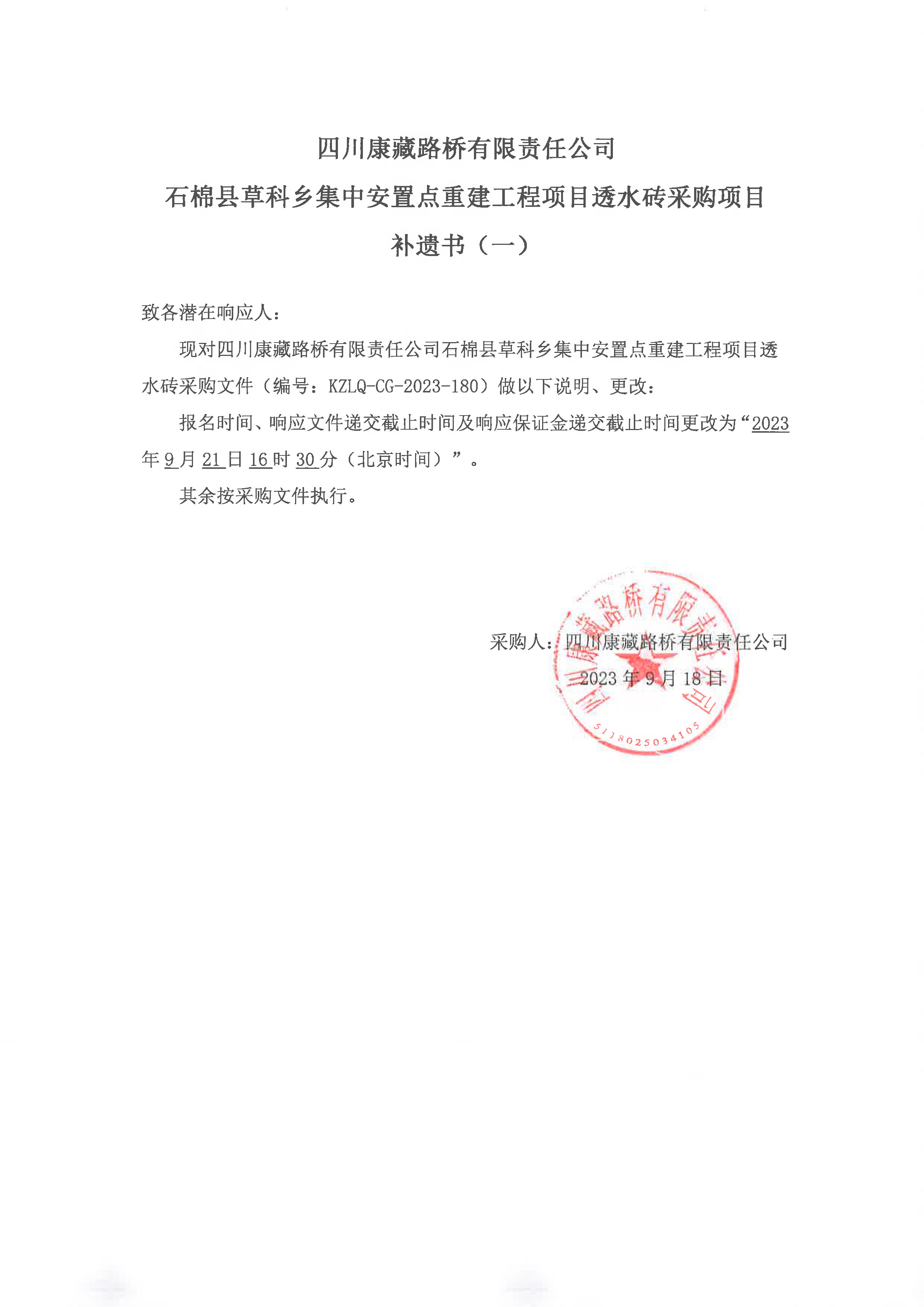 四川康藏路橋有限責任公司石棉縣草科鄉(xiāng)集中安置點重建工程項目透水磚采購項目補遺書(一)