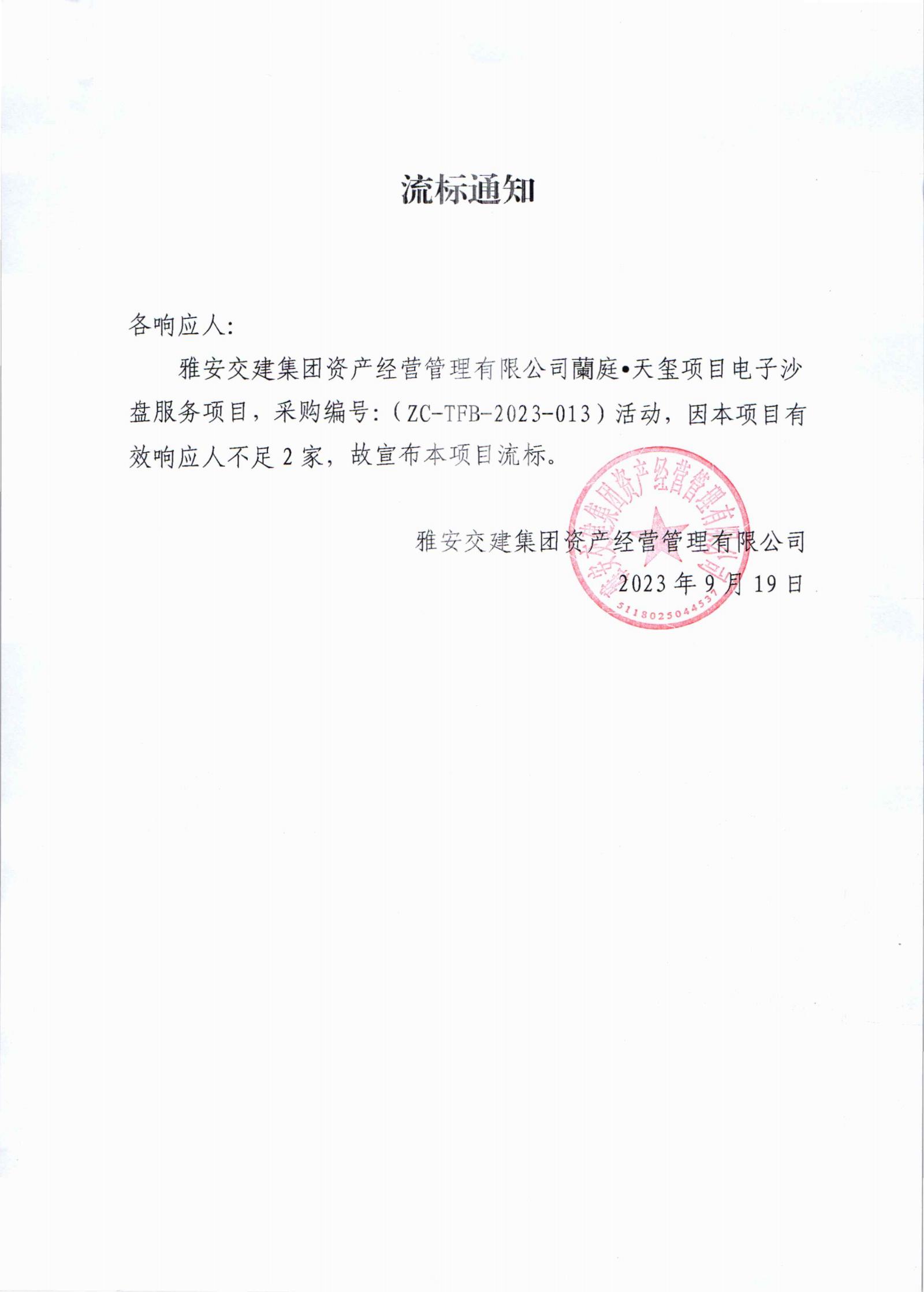 雅安交建集團資產(chǎn)經(jīng)營管理有限公司蘭庭•天璽項目電子沙盤服務項目流標通知書